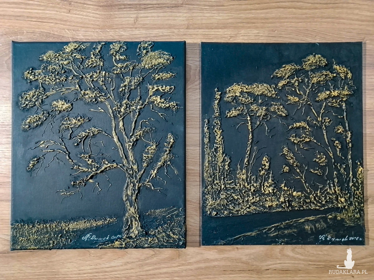 Wyjątkowy dwuczęściowy zestaw - połączenie surowej elegancji i nowoczesnego designu, dzięki czemu idealnie wpisuje się w modny styl Scandi-Glamour, loft lub nowoczesną klasykę. Szyk, natura i blask złota... Ciemna kolorystyka sprawia, że wnętrze nabiera klasy, a biżuteryjny blask przyciąga wzrok każdego widza. To coś więcej niż płótno – to gra cieni i wypukłości, które zapraszają do dotyku. Każde pociągnięcie szpachlą było starannie przemyślane, by stworzyć harmonijną kompozycję. Nie jest to wydruk, lecz autorskie dzieło z wyraźnym śladem ręki artysty. Idealne rozwiązanie dla osób szukających dodatków klasycznych i nowoczesnych jednocześnie. Dekoracja doskonała do salonu, sypialni, luksusowego gabinetu, czy na ekskluzywny prezent.