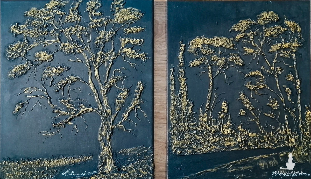 - Tematyka: Motyw drzew w abstrakcyjnej formie płaskorzeźby. Obrazy emanują spokojem natury ujętym w luksusową formę