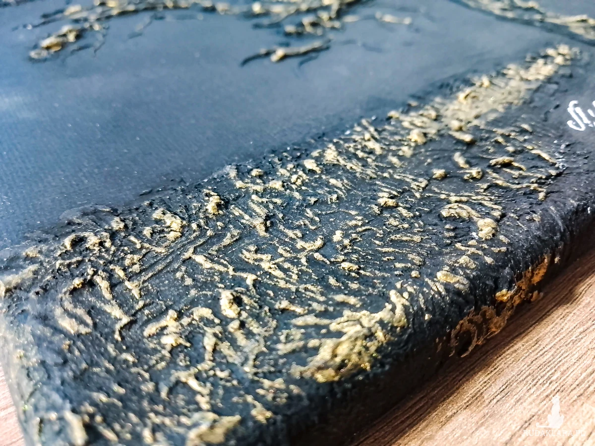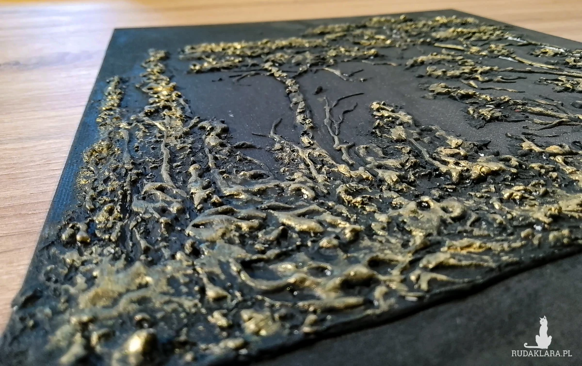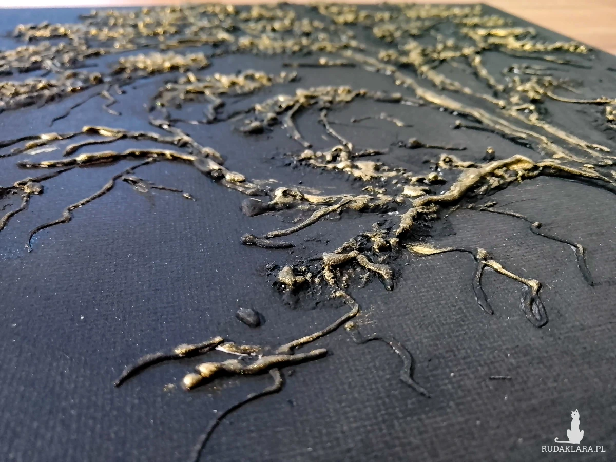 - Technika malarska: Malarstwo strukturalne z teksturą 3D z zastosowaniem pasty strukturalnej oraz farb akrylowych