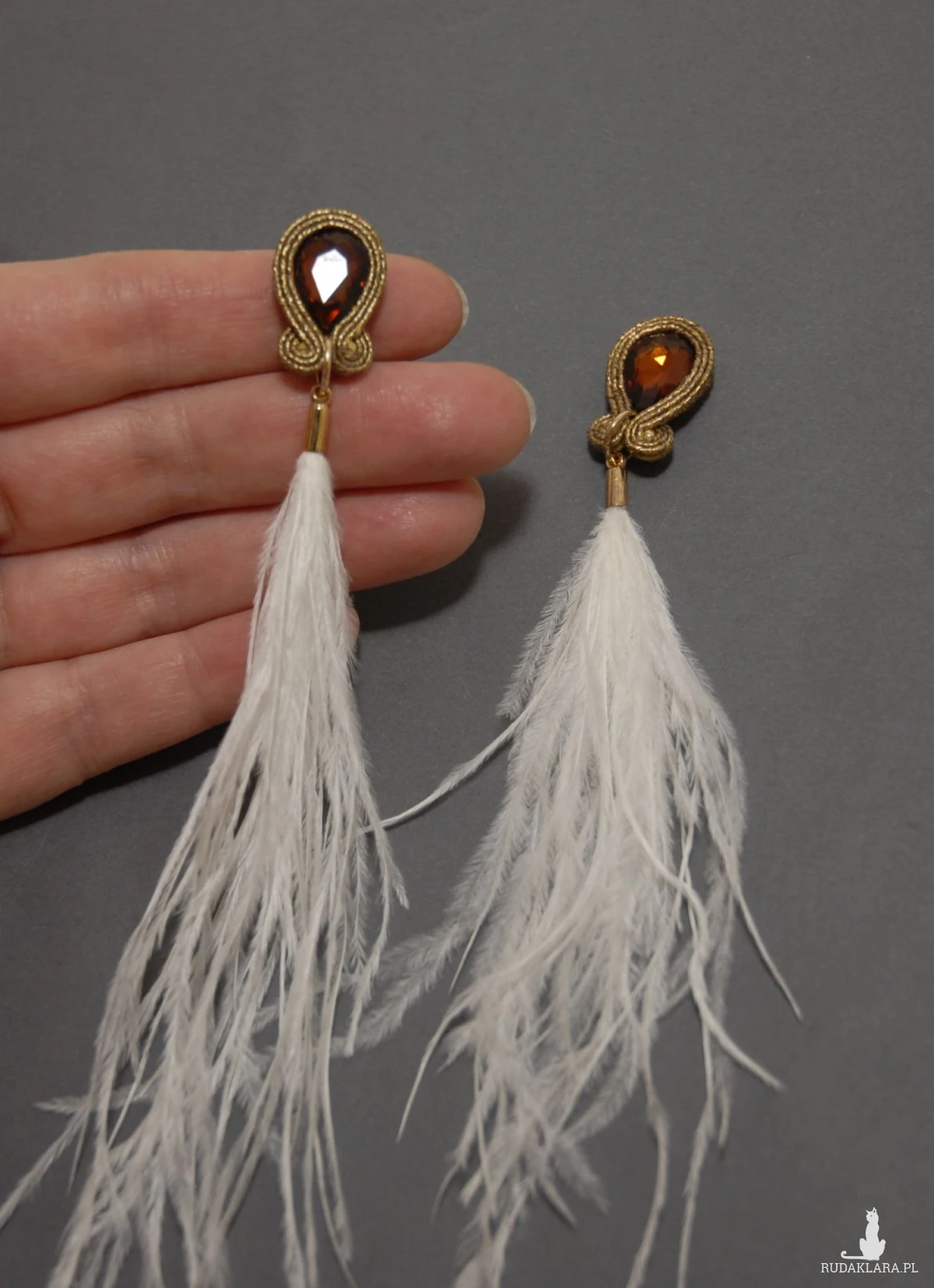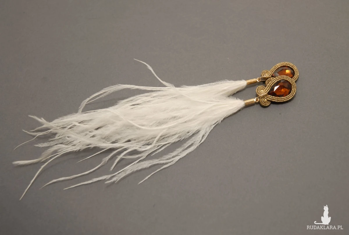 oferuję kolczyki lub klipsy zrobione techniką sutasz, ozdobione fasetowanymi, szklanymi kaboszonami i delikatnymi piórami. Sznurek jest opalizujący.