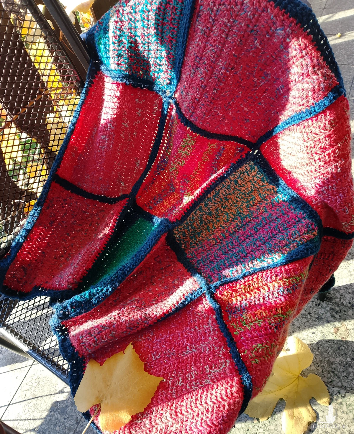 Kolorowa narzuta w całości wykonana ręcznie. Wymiary 75 cm x 95 cm.