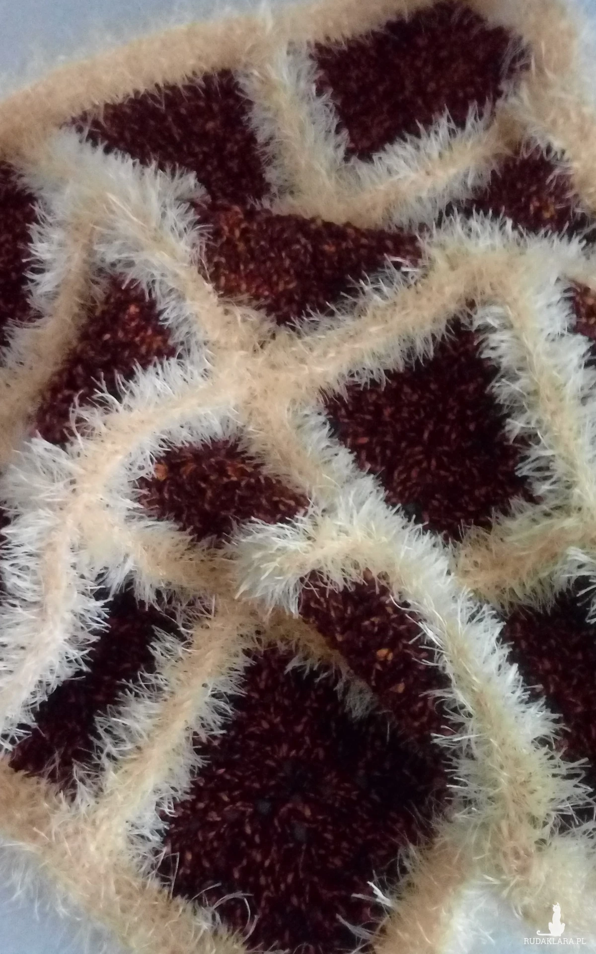 Wyjątkowy kocyk wykonany ręcznie z małych kwadratów, efektownie połączonych "włochatą" włóczką Polar Bear. Wykonanie wymagało wielu godzin pracy i cierpliwości, w efekcie czego powstała niepowtarzalna, wyjątkowa i dekoracyjna kompozycja.