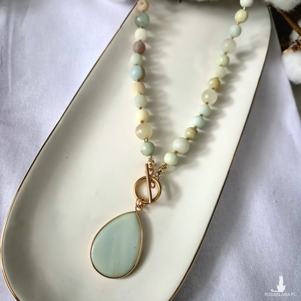 Kamienie użyte w naszyjniku to amazonit i jadeit, zarówno o matowym wykończeniu jak i błyszczącym, gładkie i fasetowane. Pomiędzy kamieniami znajdują się szklane koraliki. Poszczególne kombinacje mogą się minimalnie różnić od siebie, co jest naturalne dla kamieni naturalnych- nie ma dwóch identycznych.