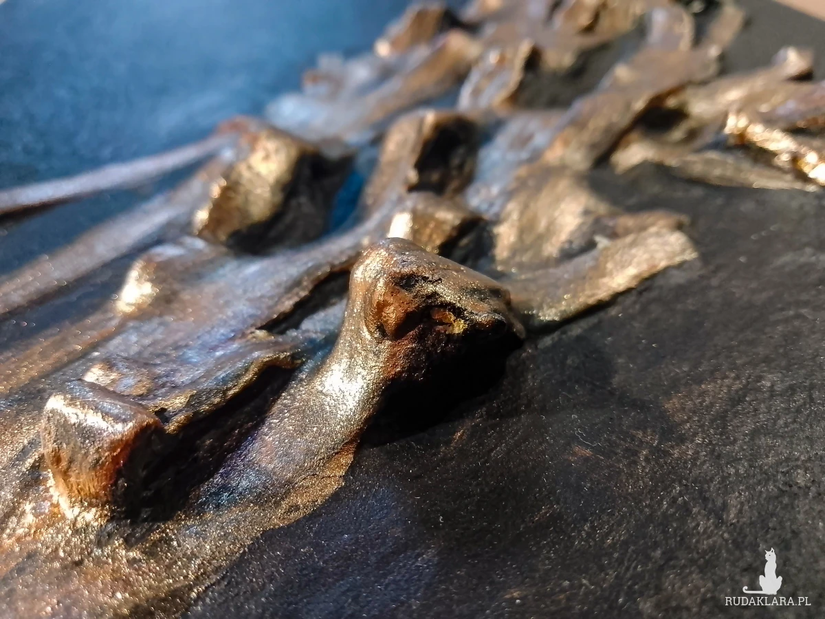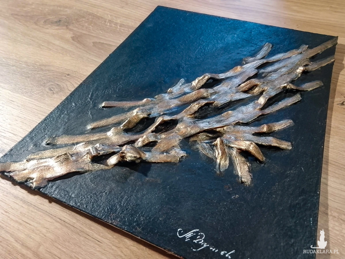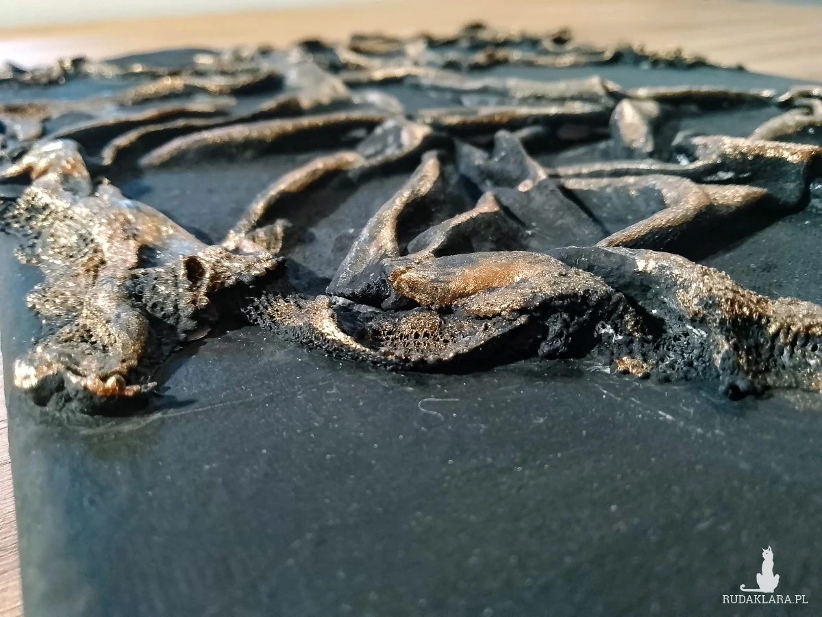 teksturą 3D z zastosowaniem modelarskiej pasty strukturalnej oraz farb akrylowych i metalicznych pigmentów