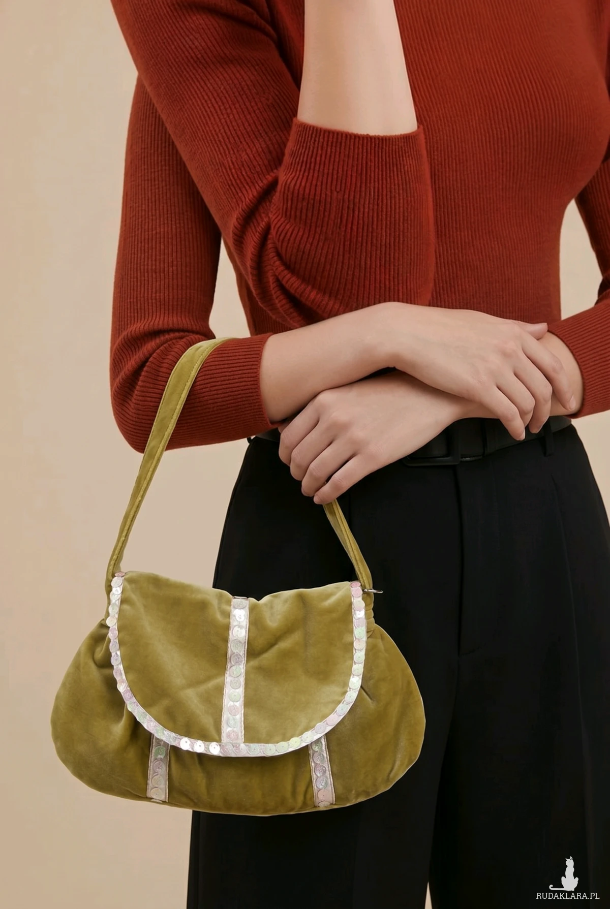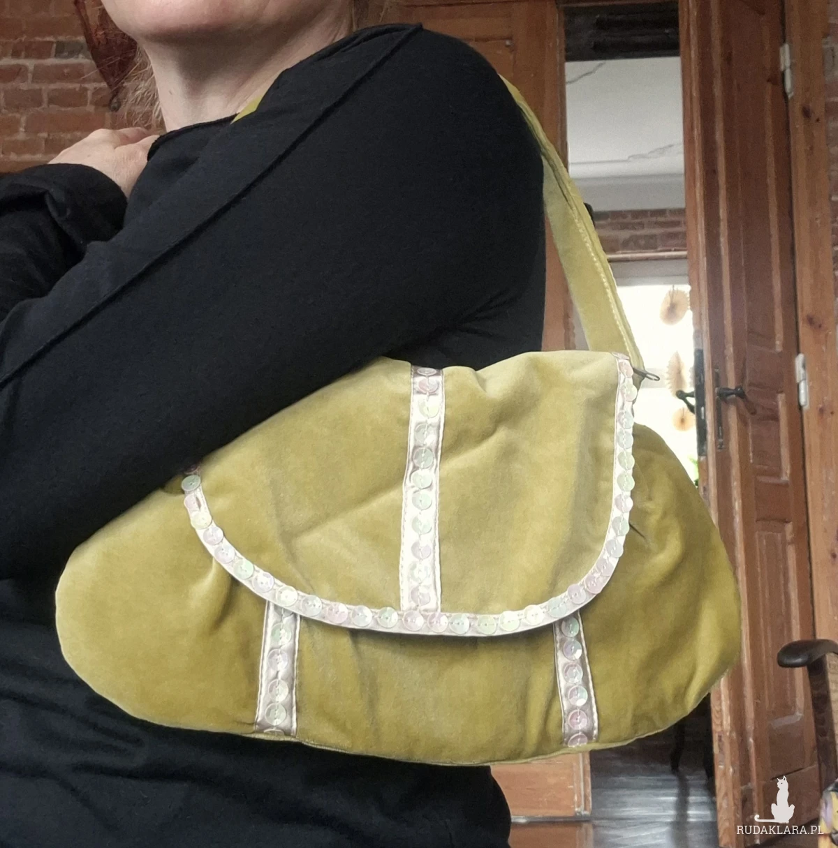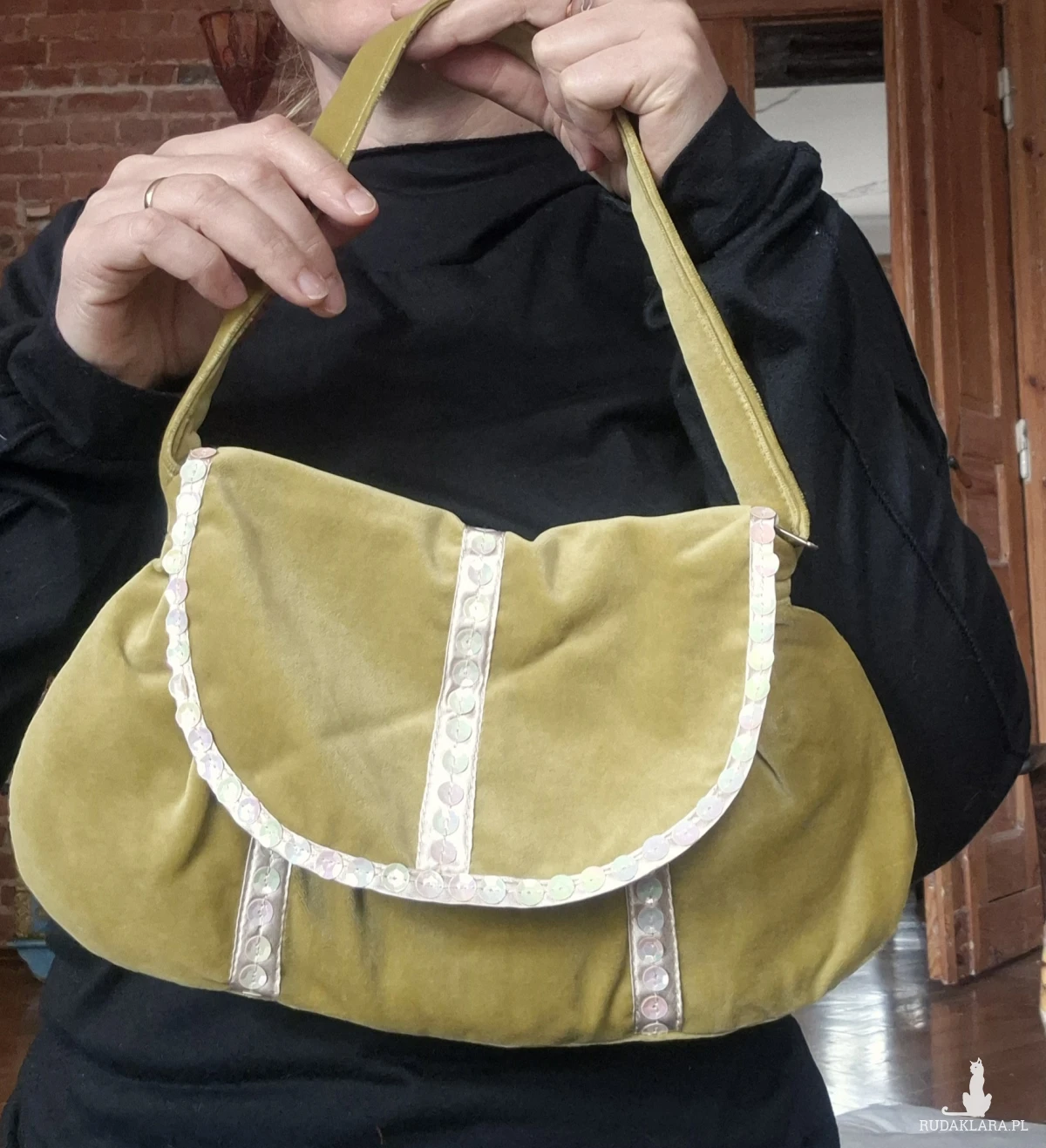 torebka damska retro cekiny  oliwkowa aksamitna handmade -wymiary 32cm na19cm- zapinana na zamek, zielona, aksamitna,koktajlowa,cudna ,w stylu retro-polecam- box x1