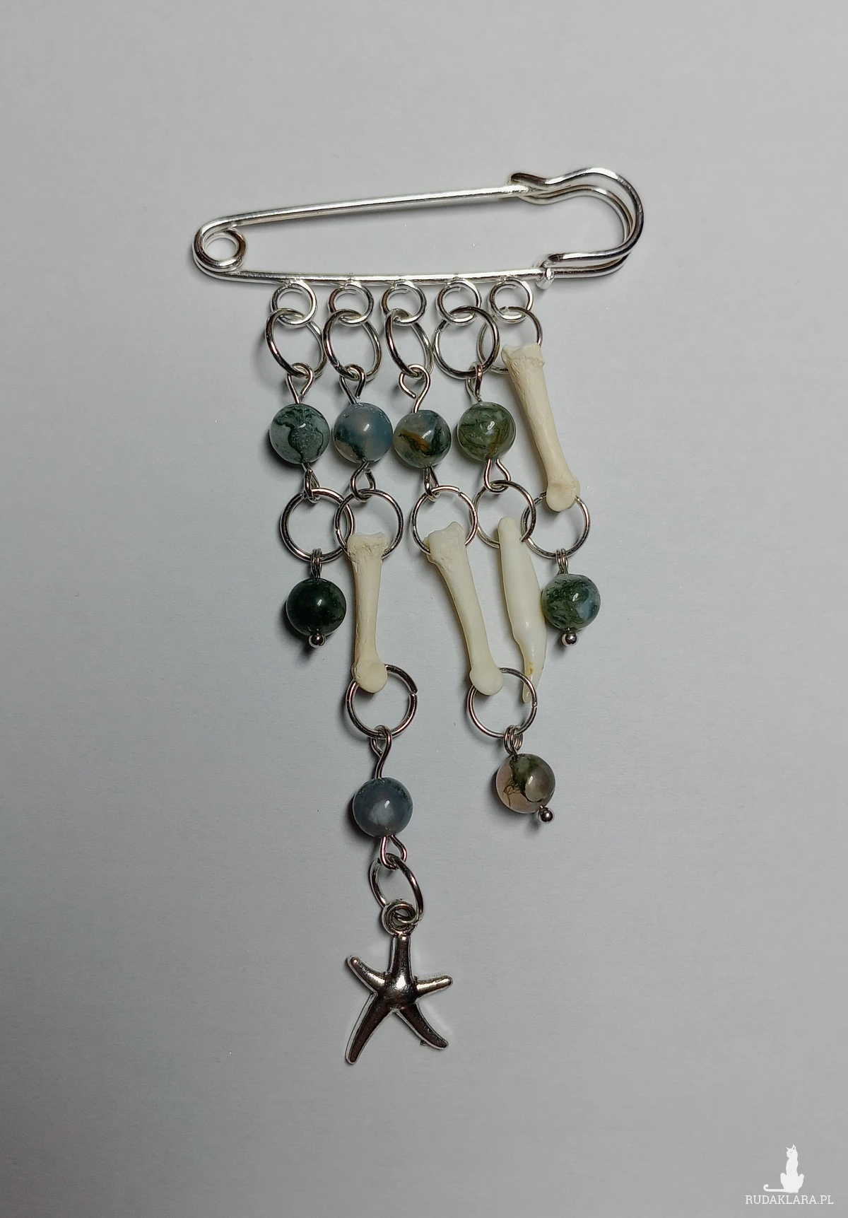 Ozdobna mała agrafka z rozgwiazdą, kostkami, kłem i koralikami z kwarciu mszystego.