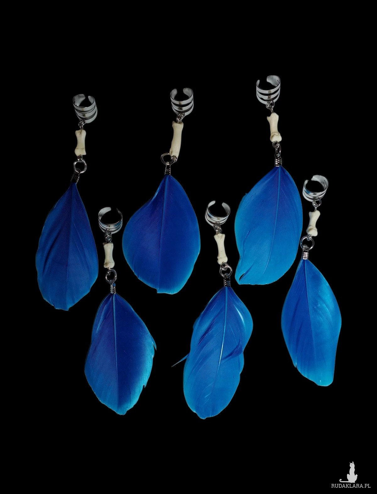 Zestaw sześciu sztuk ozdób do włosów stworzonych z niebieskich piór oraz malutkich kostek! Dopasujesz je zarówno do dredów jak i warkoczyków.
