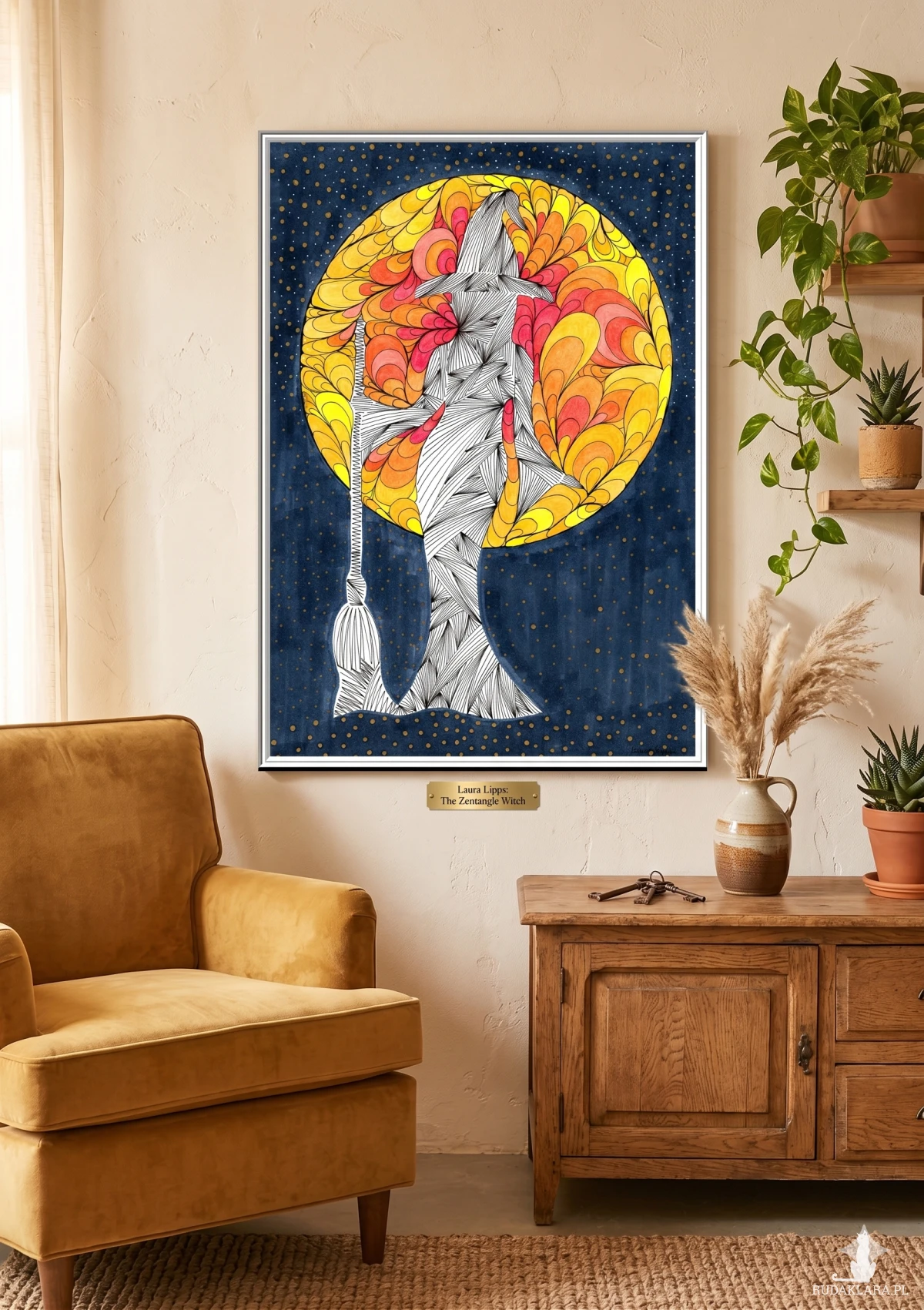 Pełnia Księżyca, tradycyjnie symbolizująca intuicję, cykliczność i ukrytą wiedzę, jest tu przedstawiona w ciepłych, wirujących kolorach. To uczucie rozświetlenia wewnętrznych prawd i dostępu do głębokiej, mistycznej mądrości. Złote kropki na ciemnym niebie dodatkowo podkreślają magiczną, kosmiczną atmosferę, gdzie granice między światami stają się płynne.