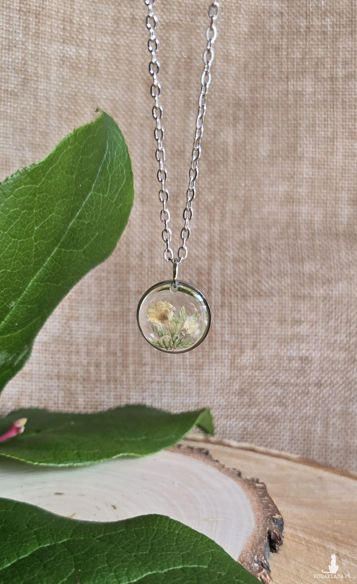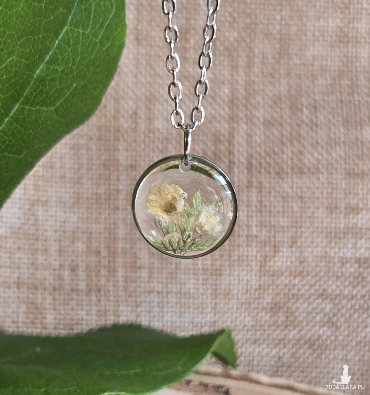 Oferuję Państwu unikalną biżuterię. Zawieszka jest wykonana z suszonych kwiatów i żywicy epoksydowej. Biżuteria jest wspaniałym i oryginalnym prezentem na lata.