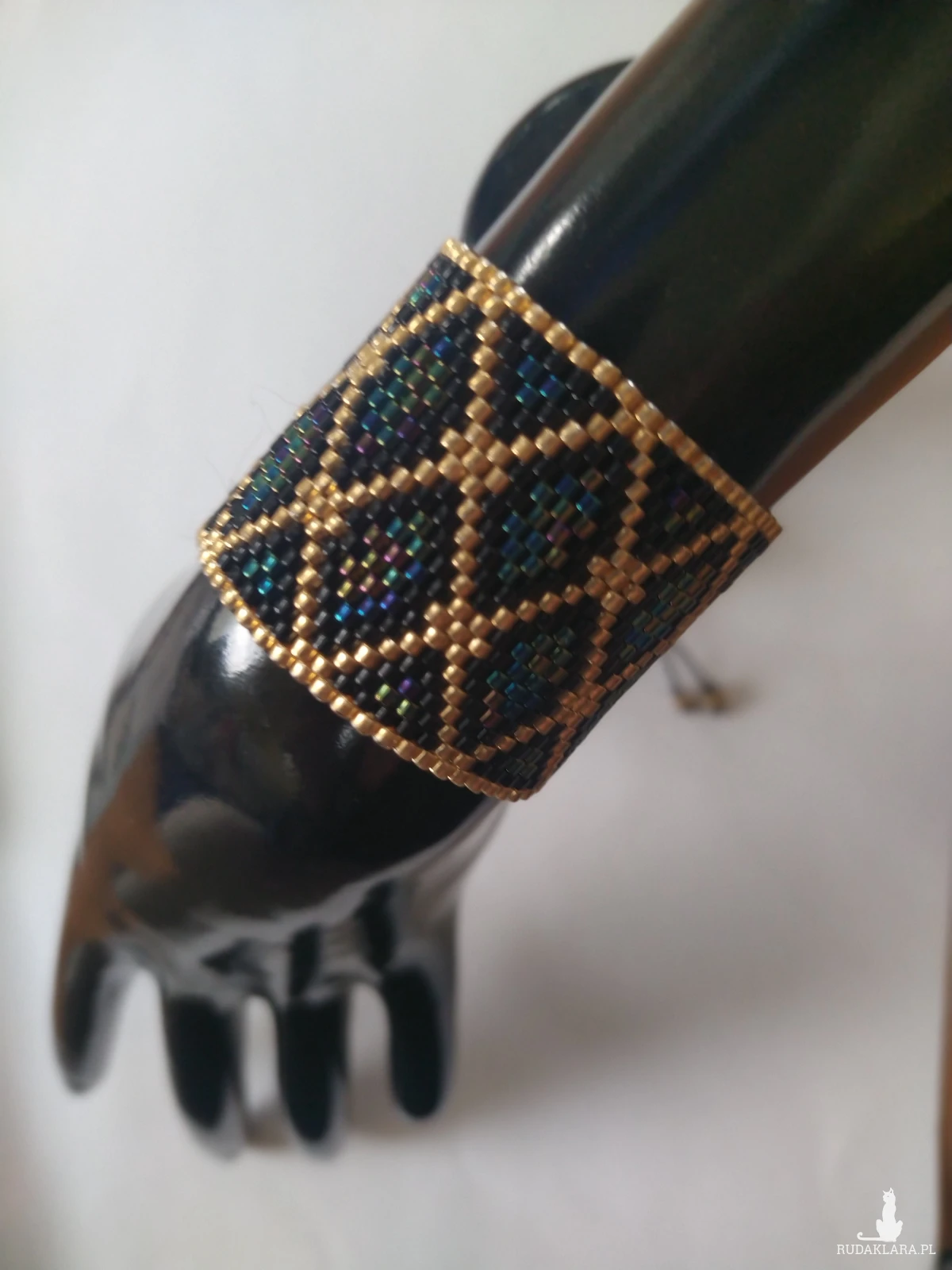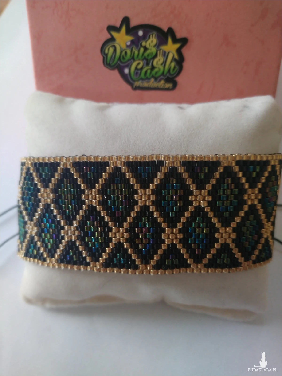 - Luksusowy Design: Wyrafinowany wzór geometrycznych rombów wykonany z tysięcy precyzyjnie dobranych koralików. Połączenie głębokiej czerni, połyskującego złota i benzynowych odcieni tworzy efekt „wow”, którego nie da się przeoczyć.