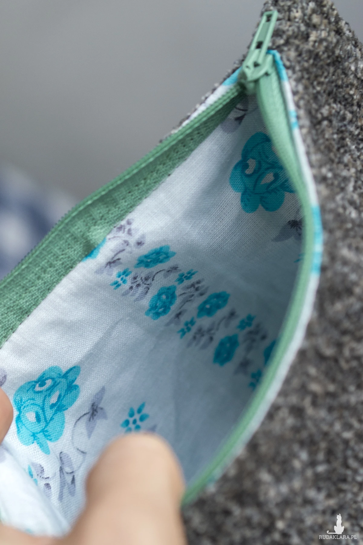Duża kosmetyczka w kolorze turkusowo-szarym. Stworzona w duchu no waste.