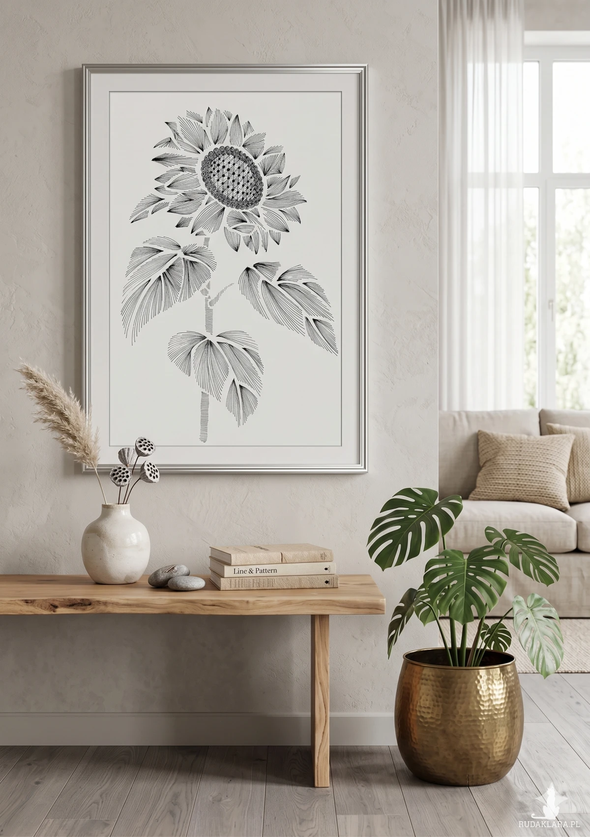 Monochromatyczna, graficzna ilustracja słonecznika, wykonana w całości przy użyciu linii