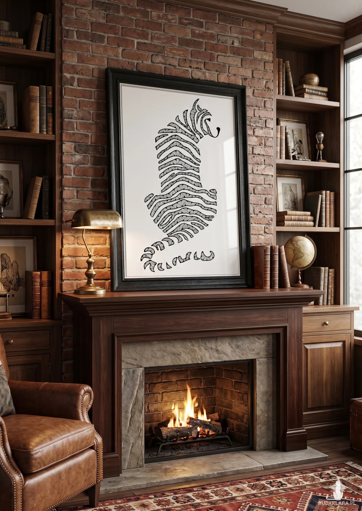 Abstrakcyjna, dekoracyjna interpretacja sylwetki tygrysa, stworzona z falistych pasów wypełnionych misternymi, geometrycznymi wzorami. Rysunek w czerni i bieli o mocno stylizowanym i graficznym charakterze, który nadaje sylwetce zwierzęcia hipnotyzujący ruch.