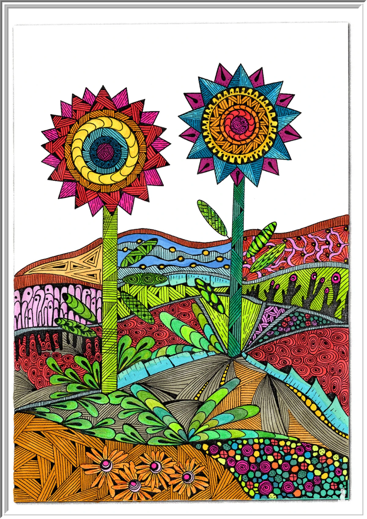 Dominują dwa duże, promieniste kwiaty w intensywnych barwach, których centra wypełnione są misternymi wzorami.
