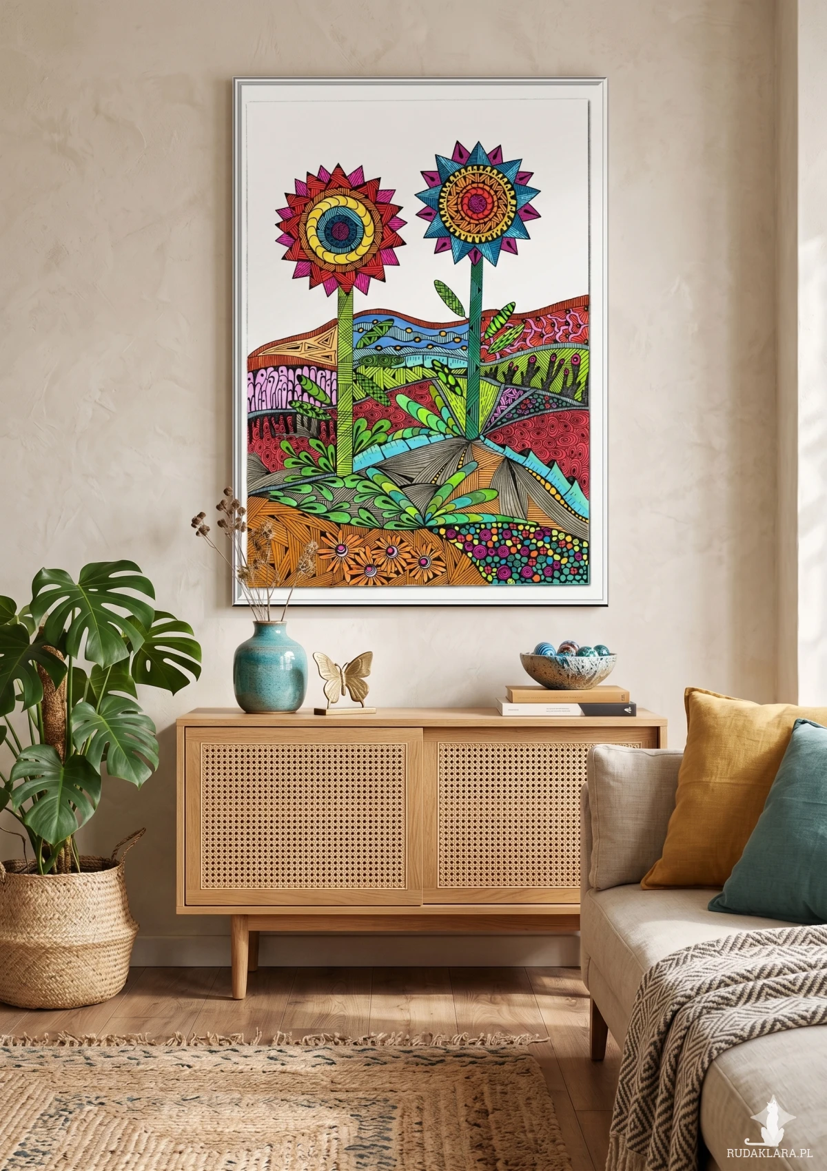 Cała dolna część rysunku to złożony patchwork wzorów geometrycznych i organicznych, symbolizujący ziemię, rośliny i pagórki, utrzymany w ciepłych barwach (pomarańcz, czerwień, zieleń).
