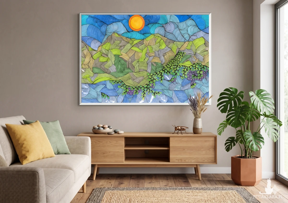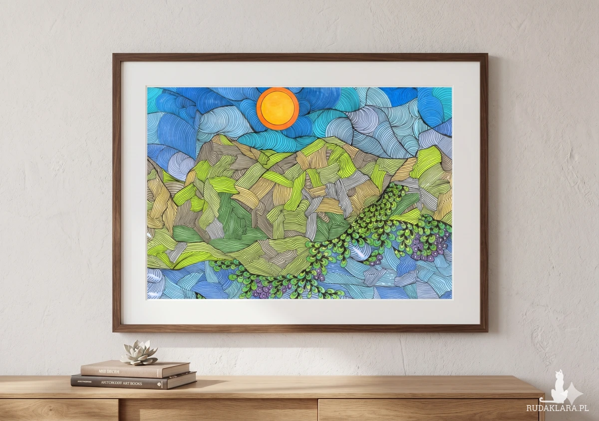 Wydruk autorskiego rysunku na satynowym papierze o gramaturze 200g/m2 - sprzedawany bez ramki - rysunki w ramkach na zdjęciach to wizualizacje. Format wydruku: A4. Wysyłka bezpieczna w kartonowej tubie. Kolory mogą się nieznacznie różnić w zależności od ustawień monitora ! Ten rysunek jest wizualną medytacją nad energią i ciągłym ruchem w naturze, a jednocześnie wyraża poczucie ujarzmionej, wewnętrznej siły. Brak gładkich powierzchni, zastąpionych przez nieustanny, falisty splot linii, sugeruje, że wszystko w naturze jest w stanie ciągłej, choć powolnej, zmiany i wibracji. To wyraża radość życia odczuwaną jako wewnętrzne drżenie i ruch. Góry, które powinny być stabilne i ciężkie, są tu zredukowane do migoczących pasm koloru. Woda i niebo płyną z podobną, oniryczną dynamiką. Emocjonalnie oznacza to akceptację płynności — świadomość, że nawet to, co wydaje się stałe (góry), jest częścią większego, nieustannego tańca życia. Jedynym gładkim i pełnym elementem jest Słońce w zenicie. Działa ono jako ogniskowa spokoju i klarowności, oświetlając skomplikowany wzór poniżej. To symbol wewnętrznego światła lub świadomości, która patrzy na złożoność świata z dystansem i spokojem, bez lęku przed jego dynamiczną i chaotyczną naturą. Emocja przewodnia: Dynamiczna Witalność i Spokojna Kontemplacja Zmiany. Styl: Ilustracja Abstrakcyjna, Stylizacja Krajobrazowa, Art Brut / Outsider Art, Doodle Art/Zentangle Inspired, Postimpresjonizm Liniowy Afirmacja: "Akceptuję nieustanny ruch życia. Choć świat wokół mnie wibruje, w moim wnętrzu panuje jasność i stabilność, pozwalająca mi z ufnością podążać za wzrostem." Krótka Mantra: "Jestem falą i jestem szczytem. Płynę i wzrastam."