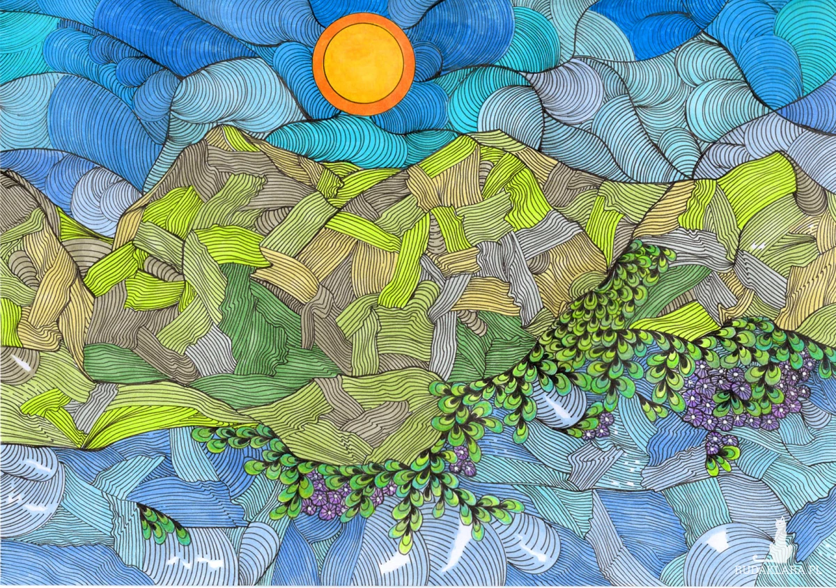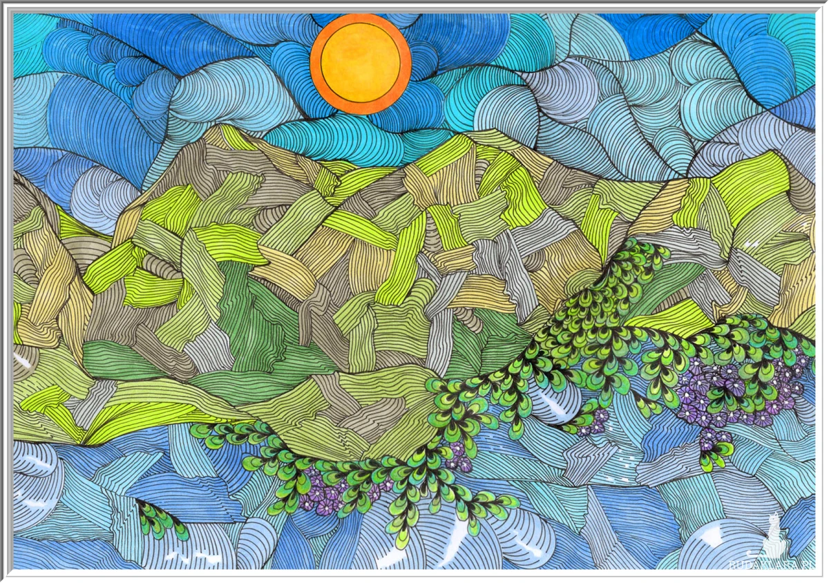 Wydruk autorskiego rysunku na satynowym papierze o gramaturze 200g/m2 - sprzedawany bez ramki - rysunki w ramkach na zdjęciach to wizualizacje. Format wydruku: A3. Wysyłka bezpieczna w kartonowej tubie. Kolory mogą się nieznacznie różnić w zależności od ustawień monitora ! Ten rysunek jest wizualną medytacją nad energią i ciągłym ruchem w naturze, a jednocześnie wyraża poczucie ujarzmionej, wewnętrznej siły. Brak gładkich powierzchni, zastąpionych przez nieustanny, falisty splot linii, sugeruje, że wszystko w naturze jest w stanie ciągłej, choć powolnej, zmiany i wibracji. To wyraża radość życia odczuwaną jako wewnętrzne drżenie i ruch. Góry, które powinny być stabilne i ciężkie, są tu zredukowane do migoczących pasm koloru. Woda i niebo płyną z podobną, oniryczną dynamiką. Emocjonalnie oznacza to akceptację płynności — świadomość, że nawet to, co wydaje się stałe (góry), jest częścią większego, nieustannego tańca życia. Jedynym gładkim i pełnym elementem jest Słońce w zenicie. Działa ono jako ogniskowa spokoju i klarowności, oświetlając skomplikowany wzór poniżej. To symbol wewnętrznego światła lub świadomości, która patrzy na złożoność świata z dystansem i spokojem, bez lęku przed jego dynamiczną i chaotyczną naturą. Emocja przewodnia: Dynamiczna Witalność i Spokojna Kontemplacja Zmiany. Styl: Ilustracja Abstrakcyjna, Stylizacja Krajobrazowa, Art Brut / Outsider Art, Doodle Art/Zentangle Inspired, Postimpresjonizm Liniowy Afirmacja: "Akceptuję nieustanny ruch życia. Choć świat wokół mnie wibruje, w moim wnętrzu panuje jasność i stabilność, pozwalająca mi z ufnością podążać za wzrostem." Krótka Mantra: "Jestem falą i jestem szczytem. Płynę i wzrastam."