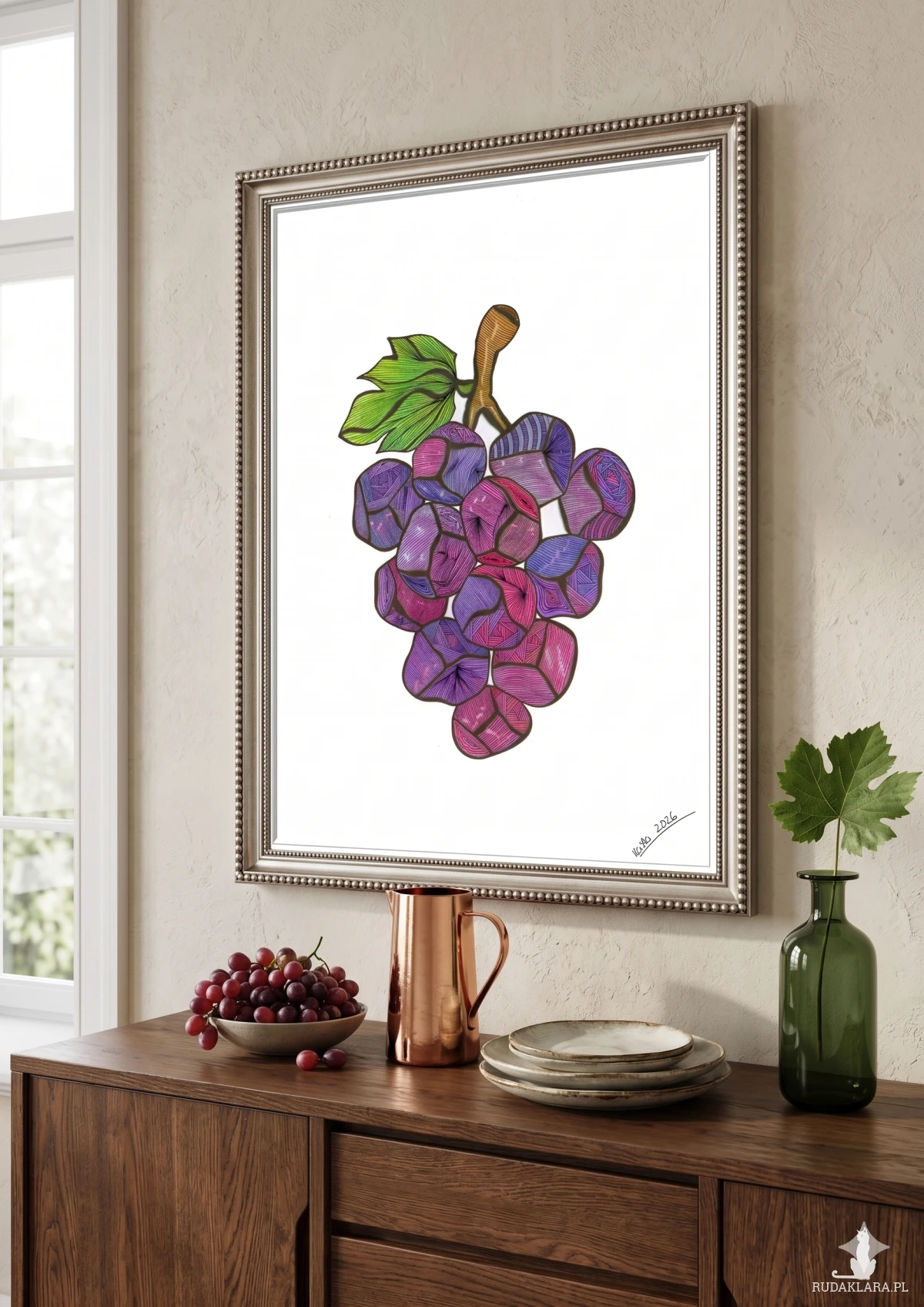 Dekoracyjna grafika przedstawiająca kiść winogron.