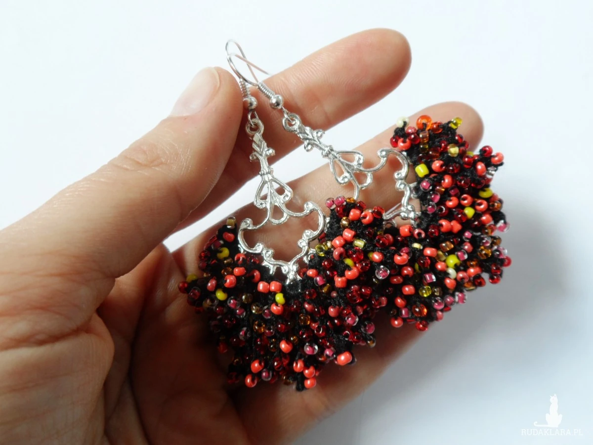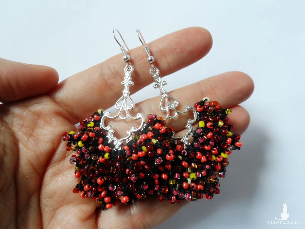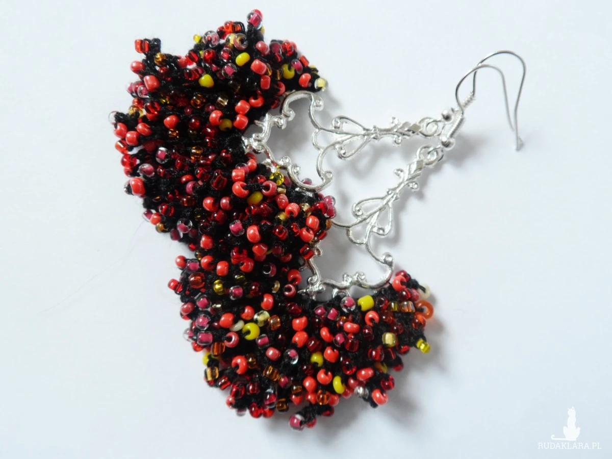 Kolczyki szydełkowe wykonane ze szklanych koralików oraz nici na ozdobnej bazie kolczykowej. Bigle antyalergiczne.