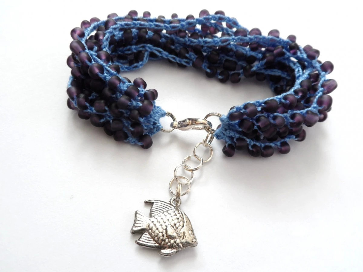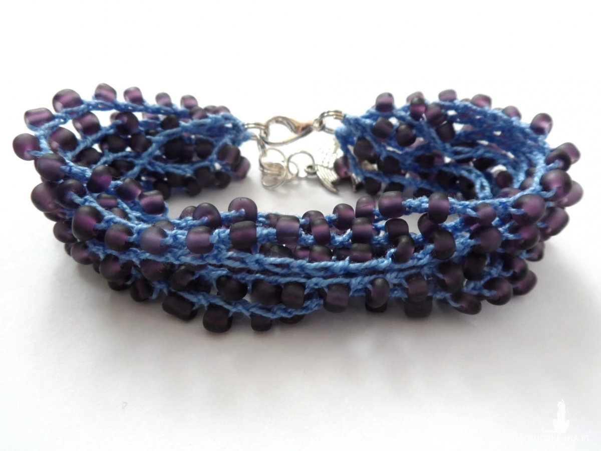 Bransoletka wykonana z 10 szydełkowych sznureczków z kordonka i koralików. Zapięcie na karabińczyk. Długość ok 20-23 cm