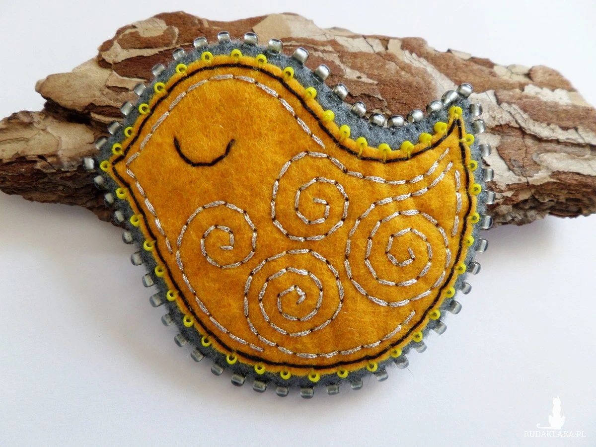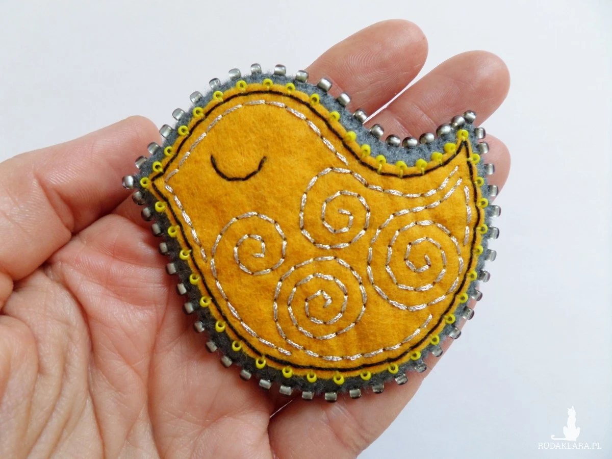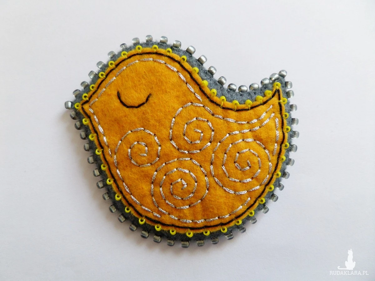 Broszka uszyta ręcznie z filcu, utwardzona delikatnym podklejeniem. Wyszywana kordonkiem, różnymi koralikami TOHO Wielkość 6 x 7 cm Kolory: żółty i szary Zapięcie tradycyjne z blokadą przeciw rozpięciu. Broszka jedyna w swoim rodzaju - kupując ją masz pewność, że nikt nie będzie miał takiej samej. Wycinana ręcznie, bez szablonu, wyszywana jak ręka poprowadzi ;) Zamawiając podobną musisz mieć świadomość, że nigdy nie będzie identyczna a tylko podobna. Staram się nie wykonywać dokładnych kopii swoich prac. Dostępne rozmiary Wymiary: 6 x 7 cm Metoda wykonania szycie Użyte materiały filc, koraliki, nici, zapięcie broszkowe