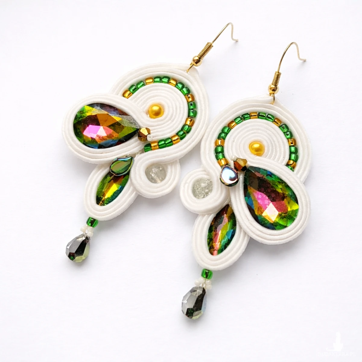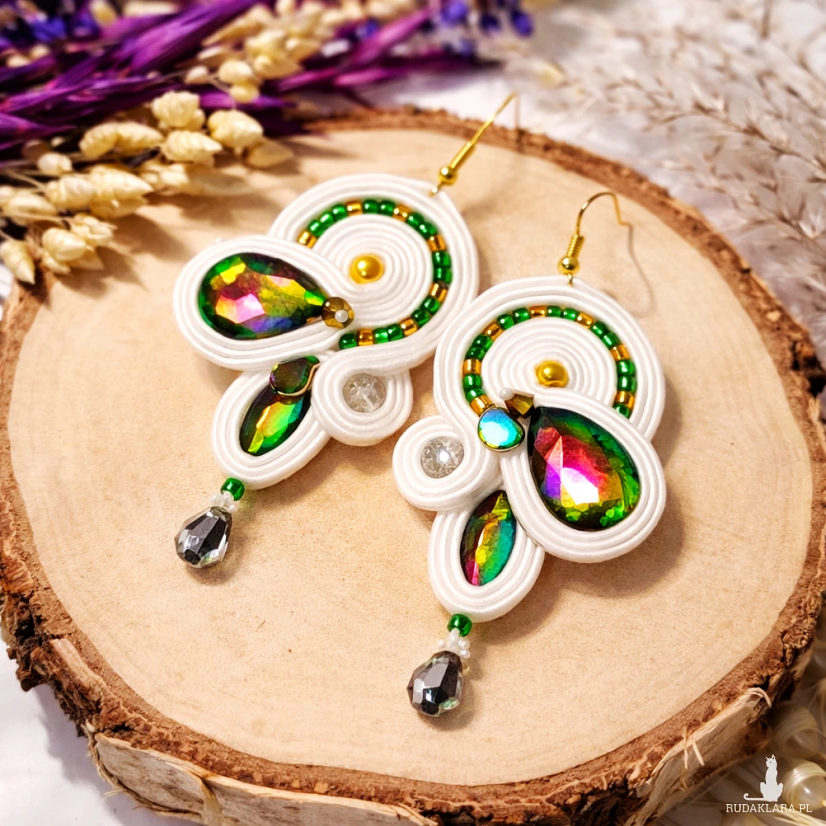 Unikatowe kolczyki stworzone techniką haftu sutasz to doskonały wybór dla kobiet poszukujących eleganckiej i oryginalnej biżuterii na wyjątkowe okazje. Centralnym elementem kompozycji są efektowne kryształy otoczone precyzyjnie wszytymi koralikami oraz sznurkami sutasz.