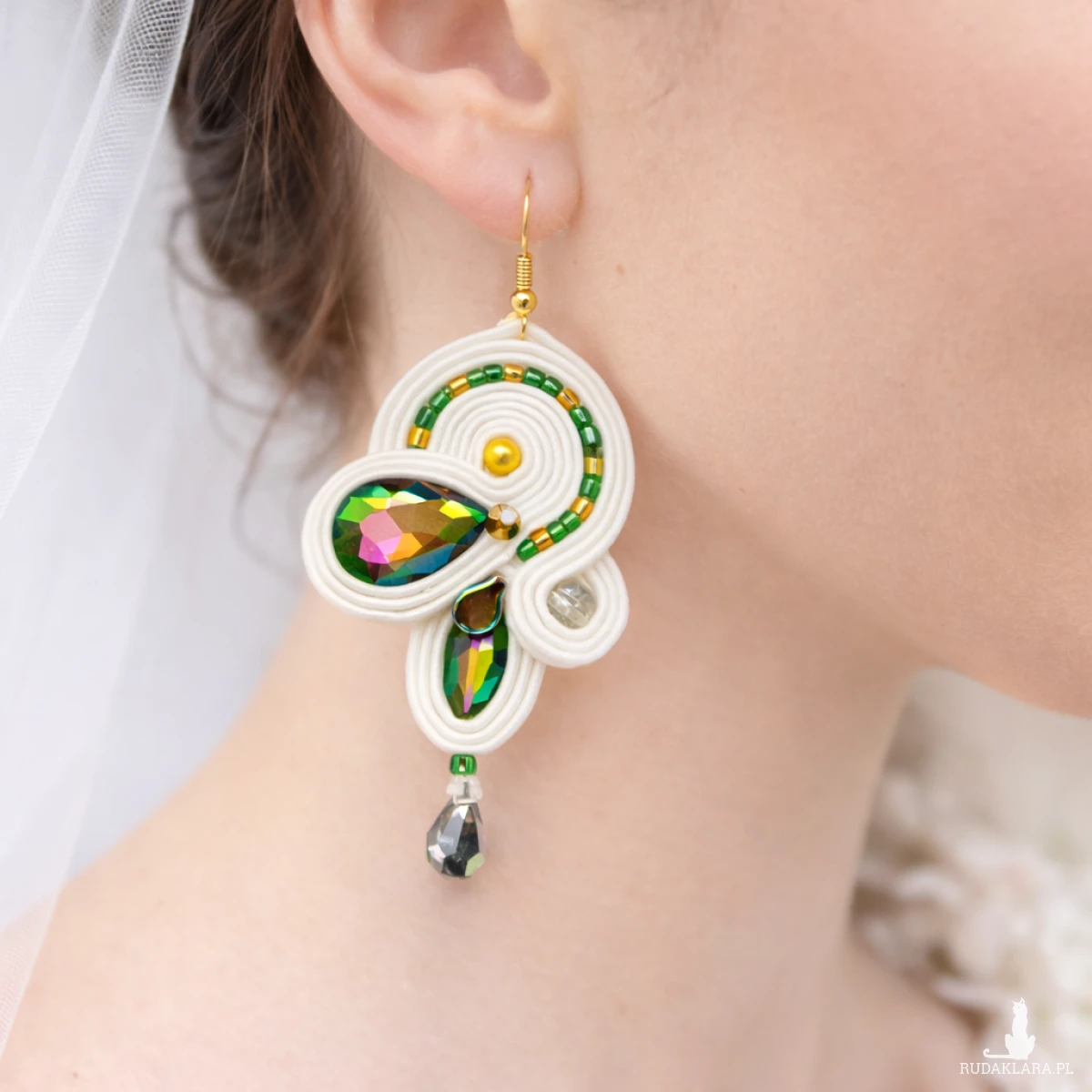 Wyjątkowe kolczyki ślubne wykonane ręcznie metodą haftu sutasz. Subtelna forma z witrażowym kaboszonem i szklanymi koralikami doskonale podkreśli stylizację panny młodej, druhny lub gościa weselnego. Idealne jako elegancki dodatek do sukni ślubnej w stylu boho lub glamour.