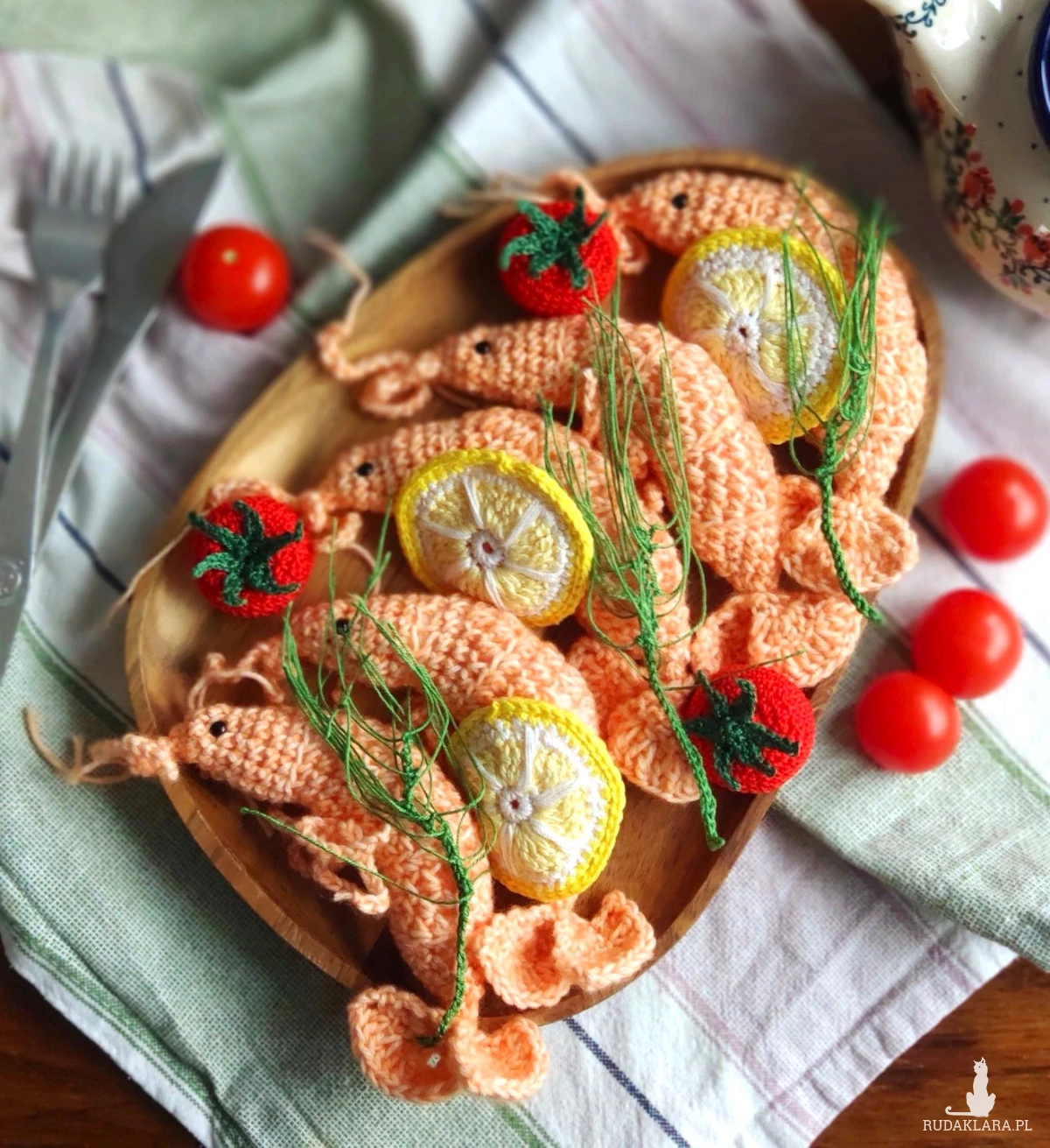 Krewetka (1 szt.)- szydełkowa zabawka doskonała do dziecięcej kuchni, nauki kolorów a także jako kuchenna dekoracja. Krewetka została wykonana z dbałością o szczegóły z włóczki bawełniano - akrylowej. Wnętrze krewetki zostało wypełnione antyalergicznym puchem silikonowym. Posiada zamontowane bezpieczne oczy.
