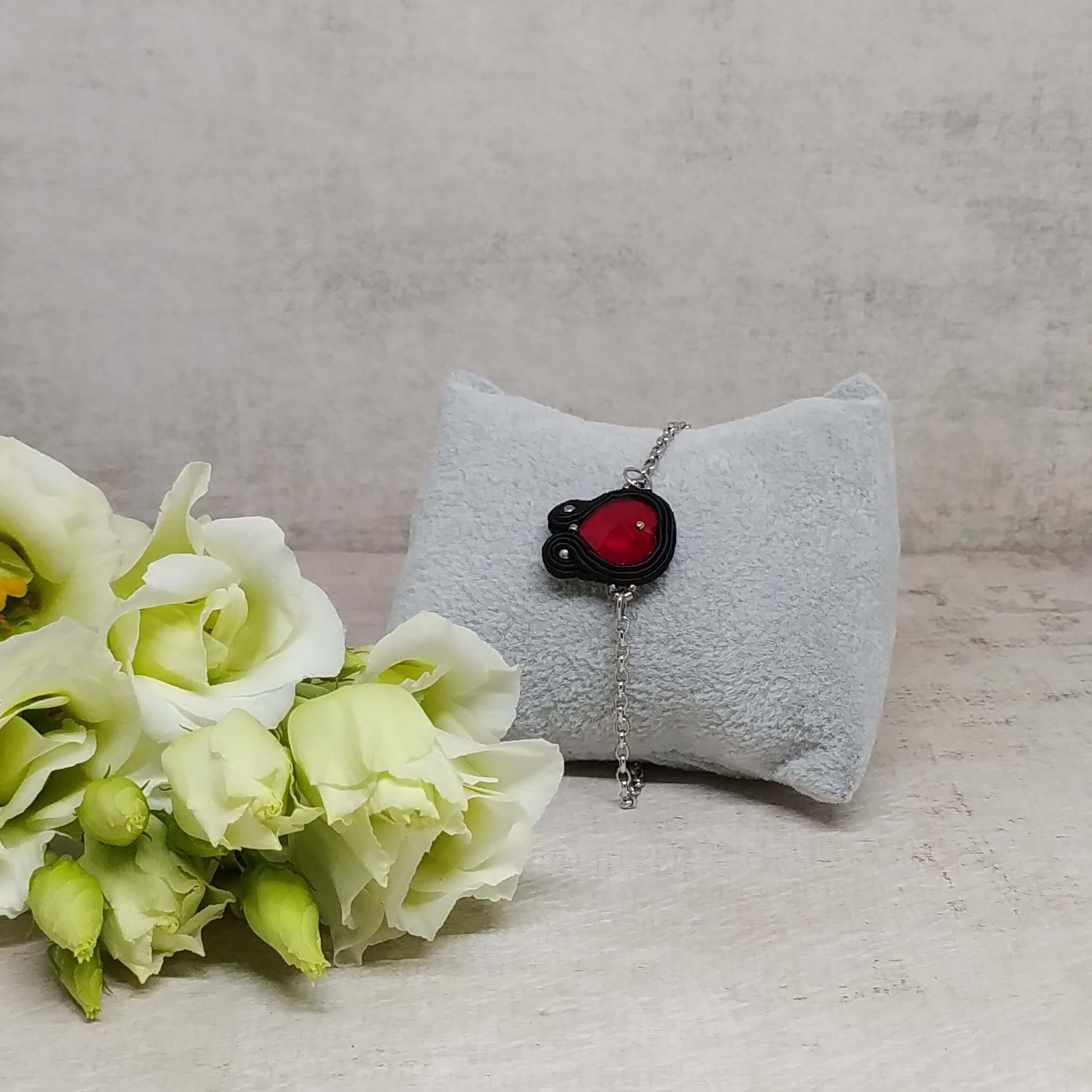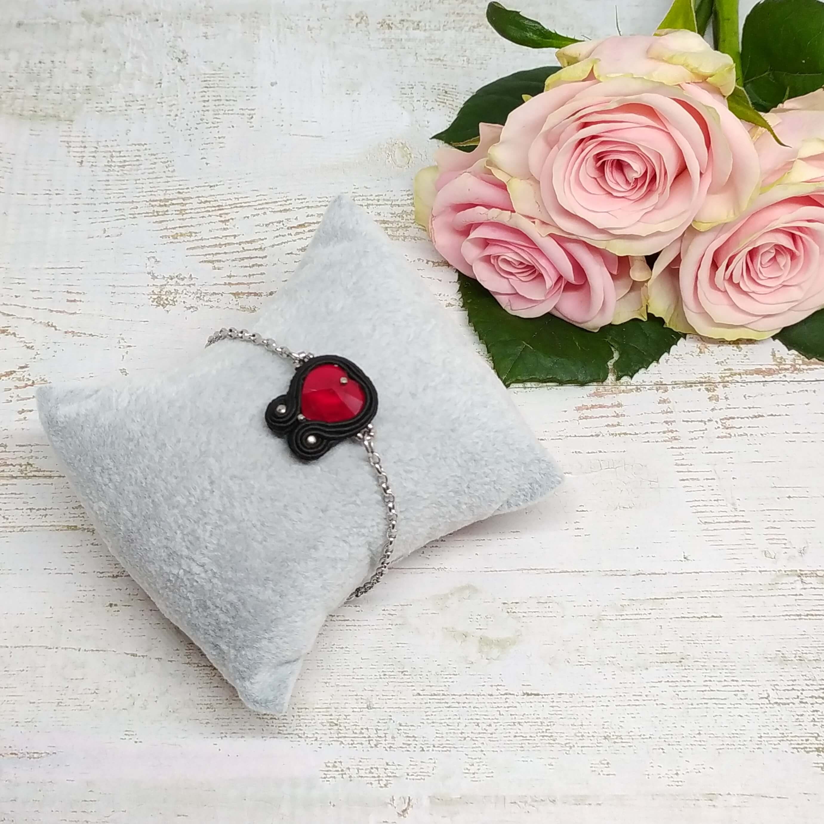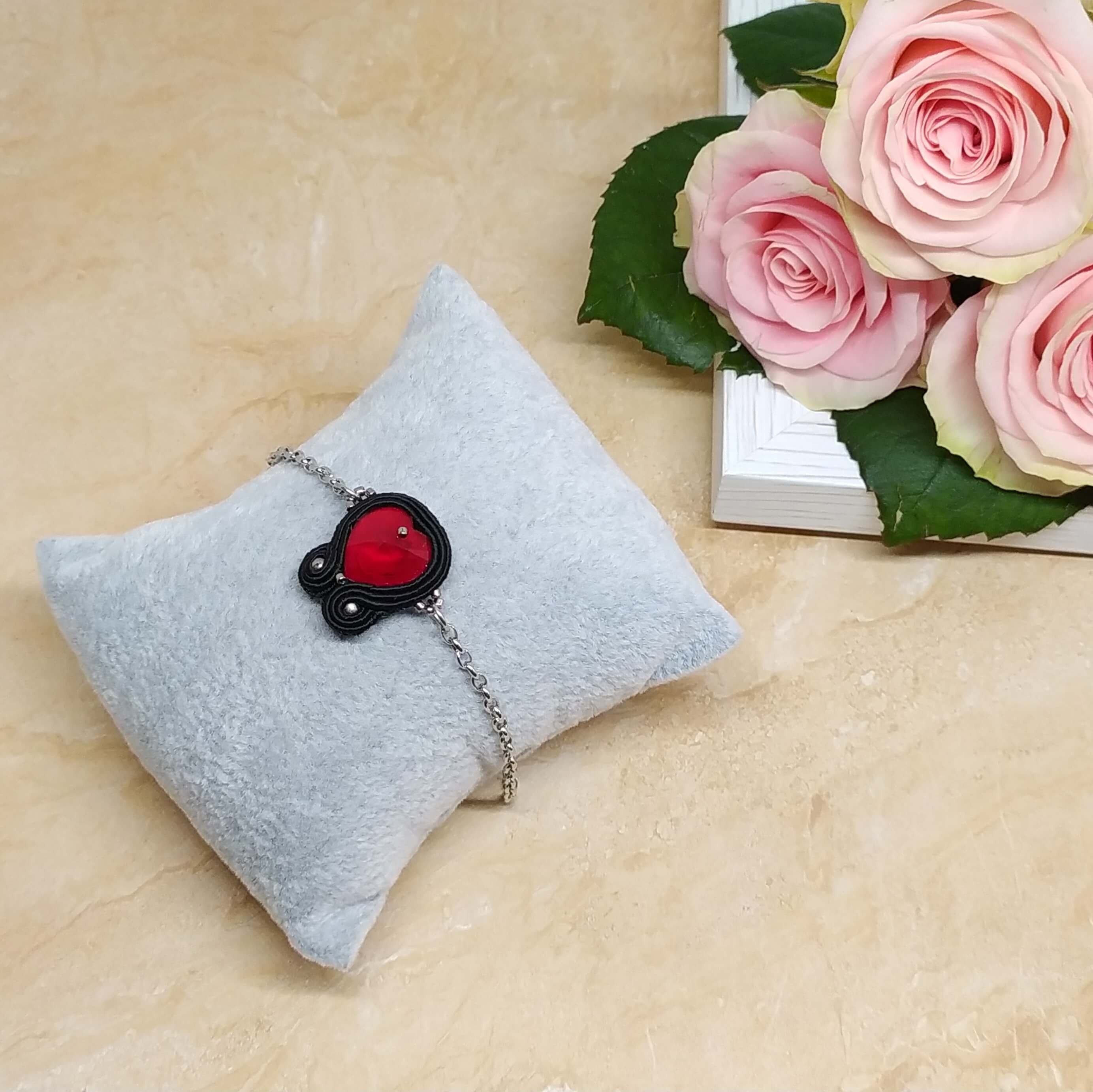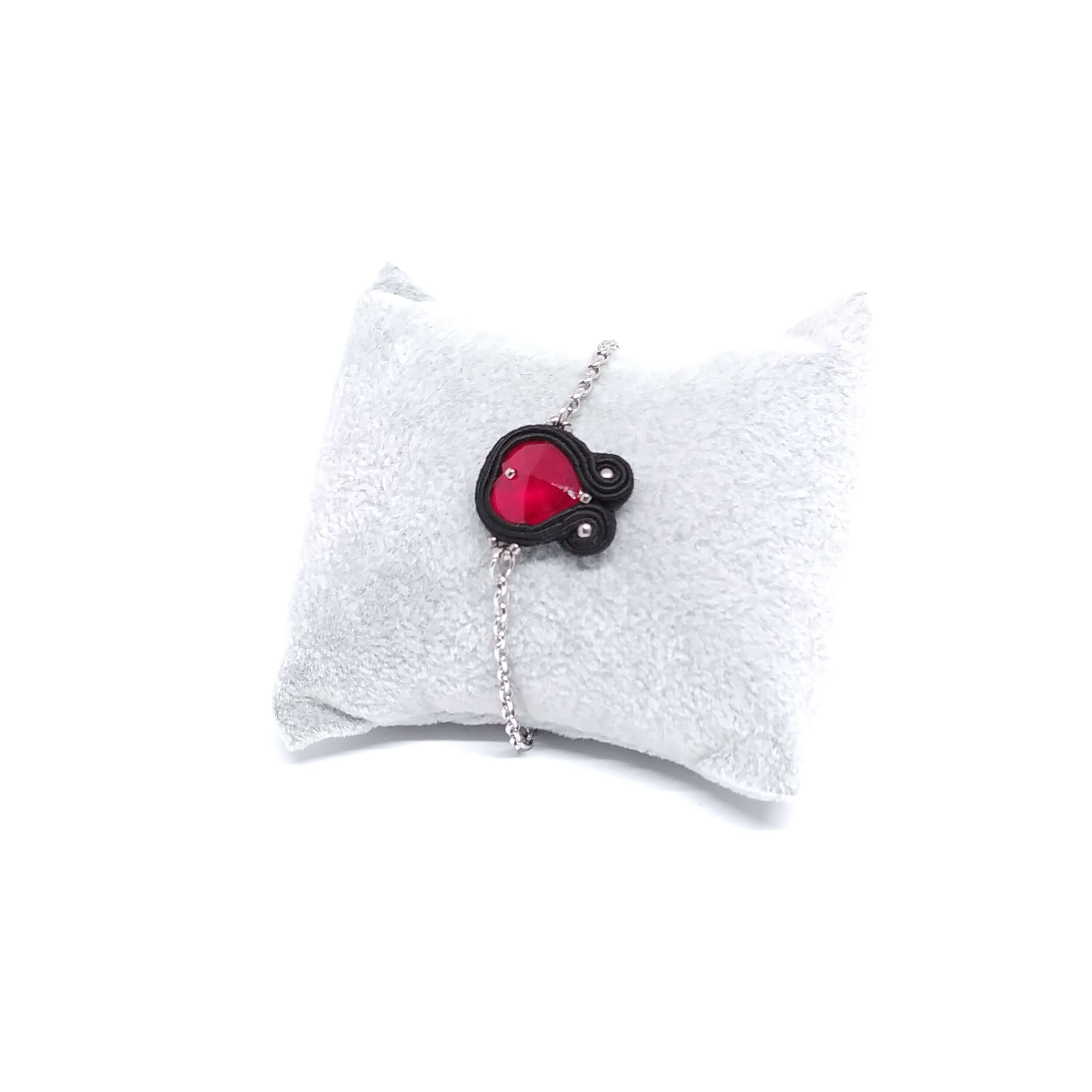 Serduszkowa bransoletka jest delikatna i subtelna, a jednocześnie przyciąga wzrok. Blask kryształka Swarovski w kolorze light siam (ognista czerwień) podkreślają czarne pasma sutaszu.