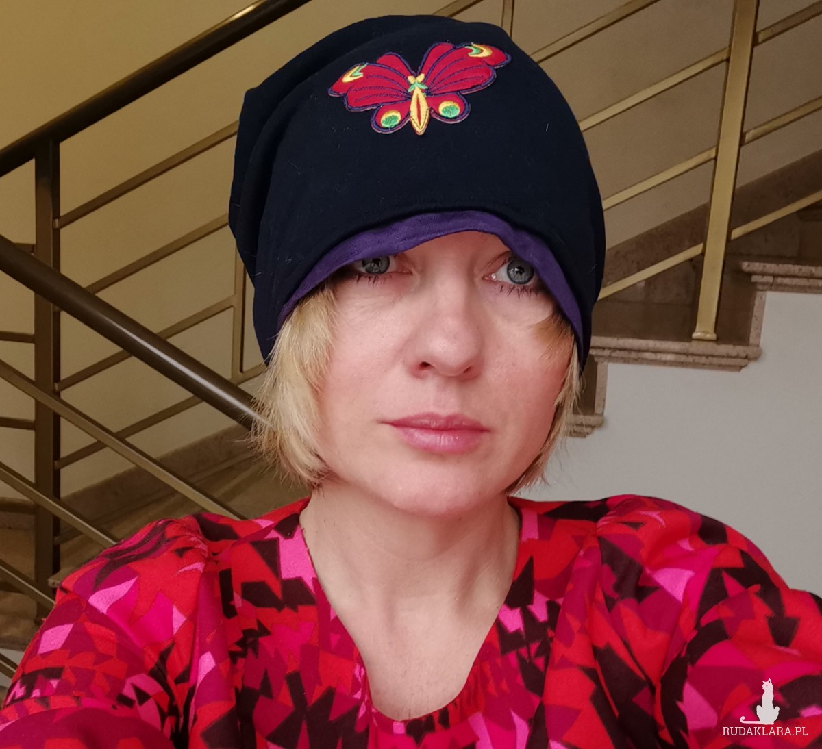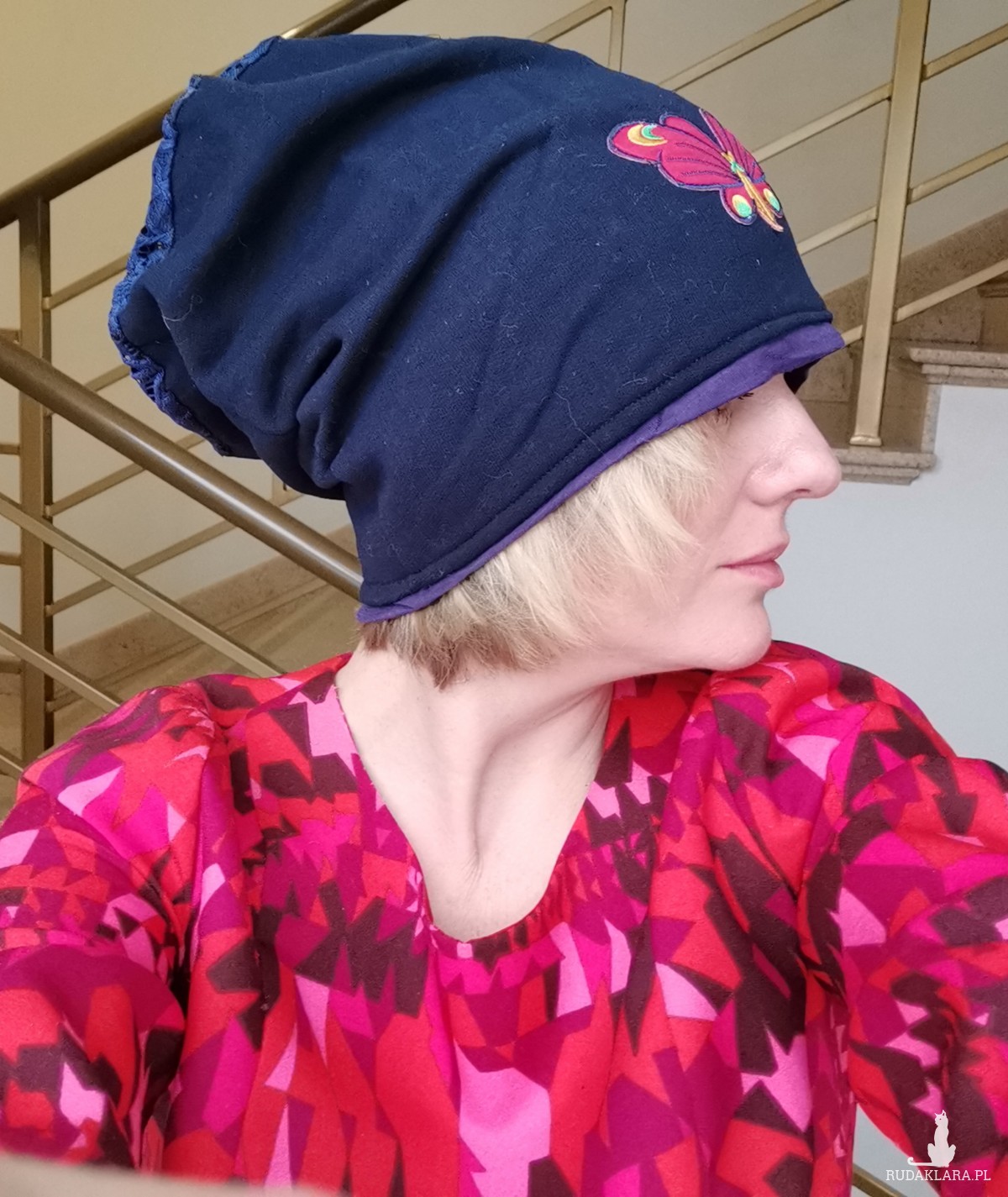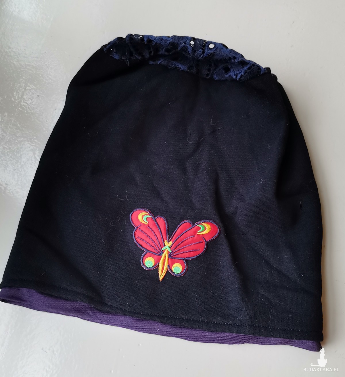 Czapka damska granatowa z motylem na podszewce, obwód uniwersalny polecam box d1
