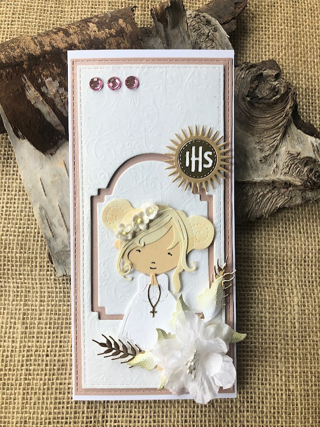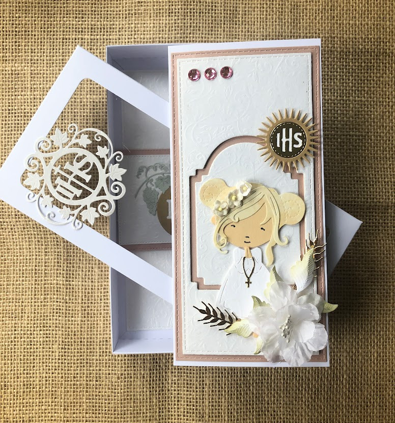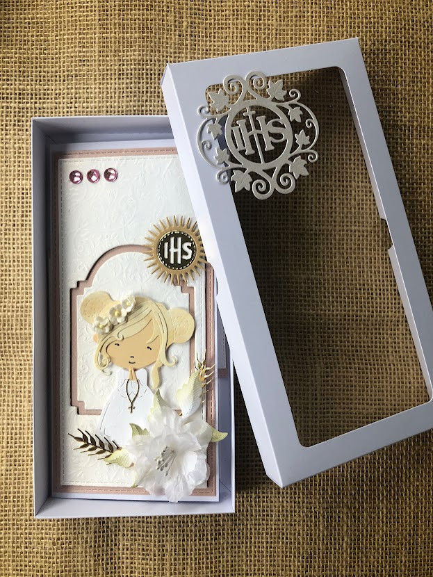 Elegancka, bogato zdobiona kartka w pudełku z okazji Komunii świętej. Utrzymana w delikatnej kolorystyce - bieli i pudrowego różu.ozdobiona kwiatami z papieru oraz postacią dziewczynki. Kartka jest w całości wykonana ręcznie z najlepszej jakości materiałów do scrapbookingu. Wielkość pudełka 22,5x11,5x3,0.Wielkość kartki 21x10,5 z miejscem na wypisanie własnoręcznie życzeń. Na dnie pudełka umieszczono kieszonkę na małe co nieco. w tej postaci produkt dostępny od ręki .Polecam