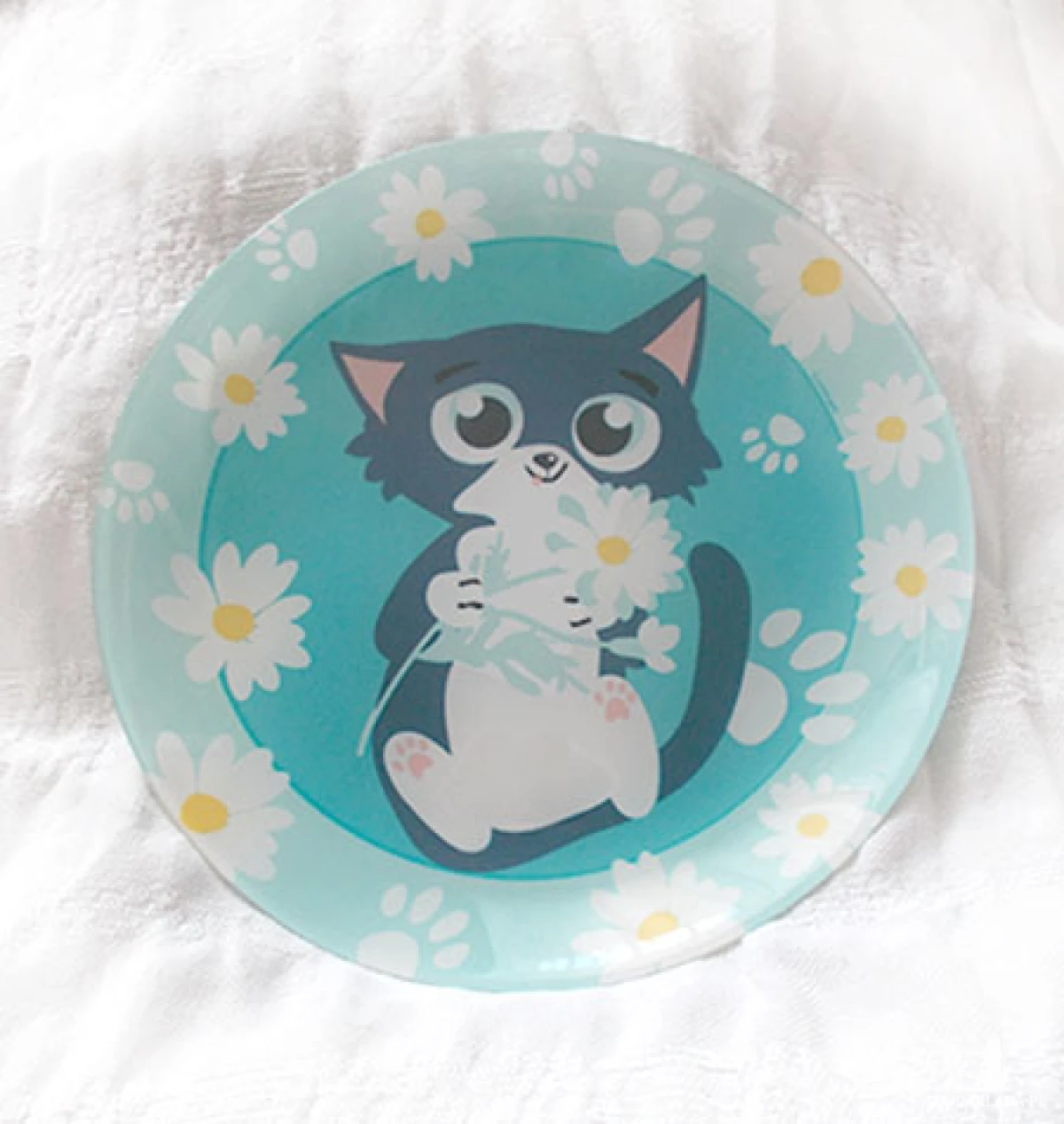 Nowy, szklany, kolorowy talerzyk deserowy, wzór z kotkiem, średnica; 20,5 cm, wysokość 1,3 cm, marka "Luminarc", wysoka jakość. Nadaje się do mikrofalówki oraz zmywarki.