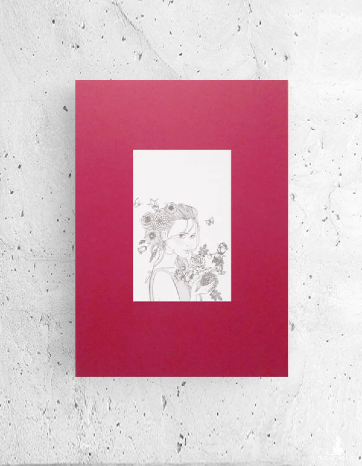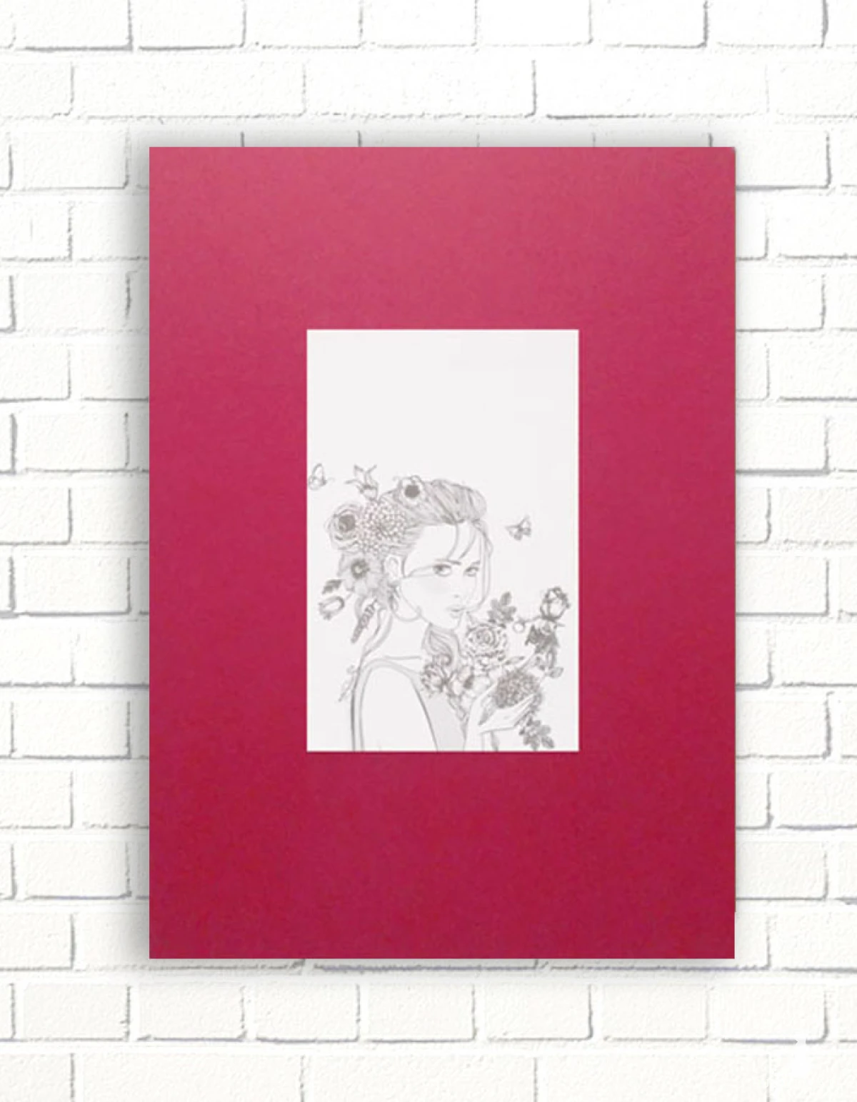 Mały plakat z dziewczyną. Ilustracja na bordowym kartoniku formatu A4.