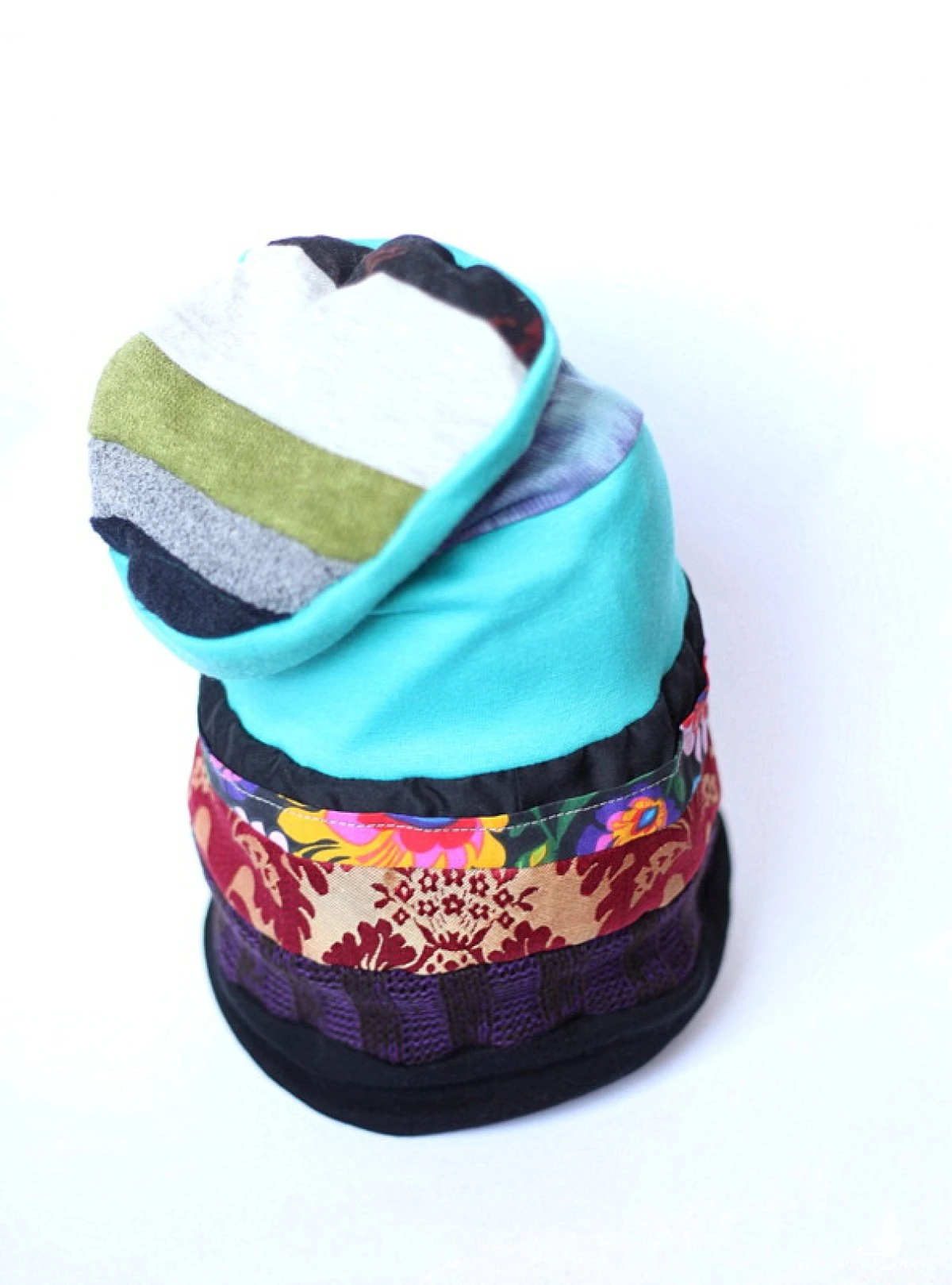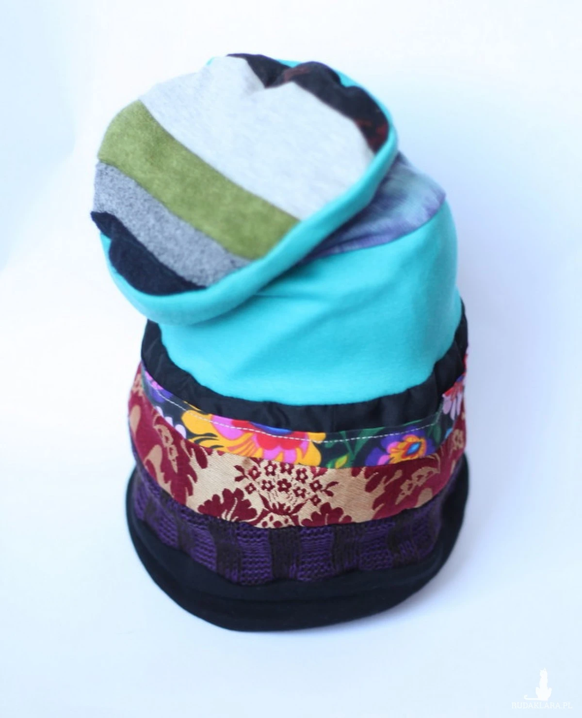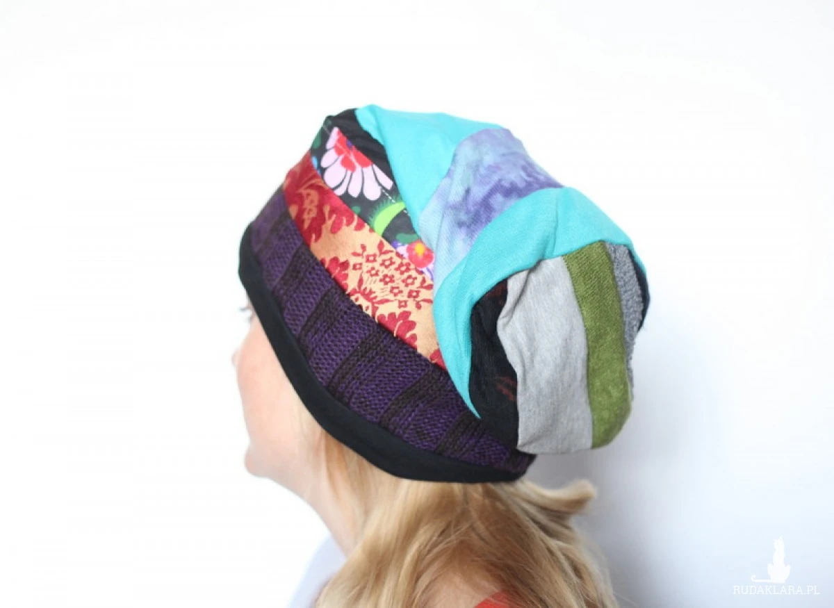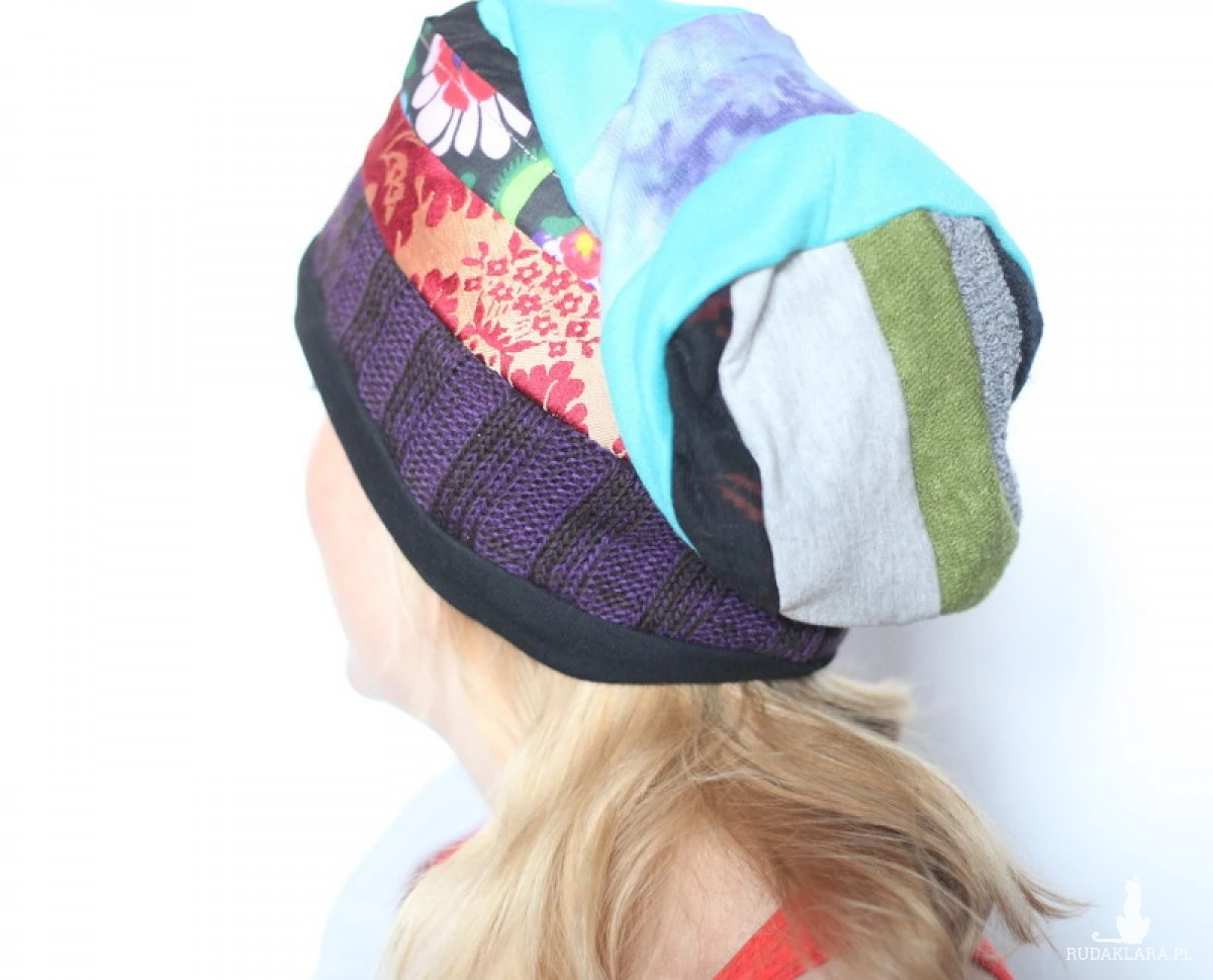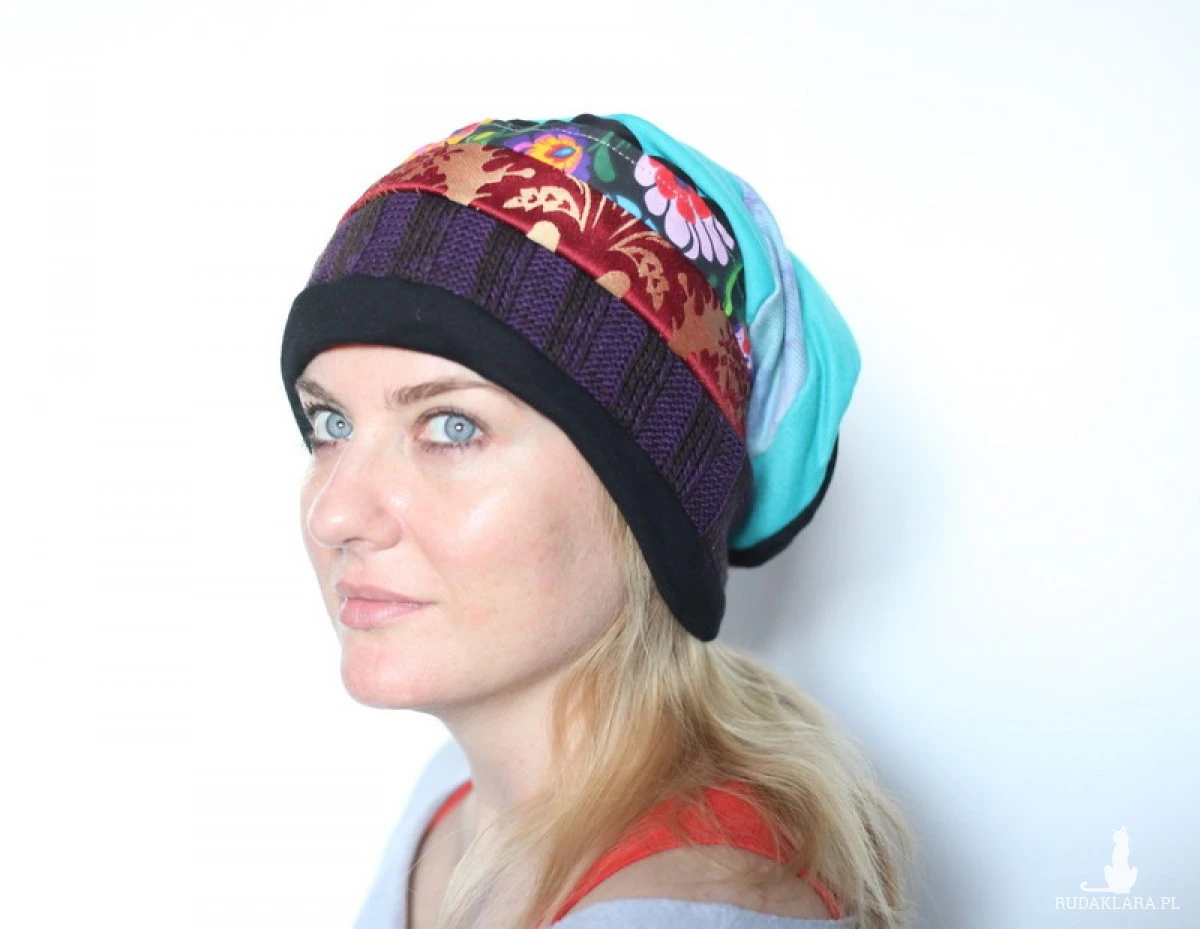 czapka damska handmade nie ściągaj galotów podczas zalotów A1 czapka 59cm,na podszewce, materiał łączony patchworkowo, czapka bardzo ciepła, kolorowa, zwracająca uwagę w stylu meksykańskim, krzykliwa, łączone materiały to dzianina ręcznie farbowana, wełna, dzianina fabryczna, tkanina, czapka miękka, lekko rozciągliwa, bardzo miłą, dobra na codzienne noszenie jak i na prezent, polecam