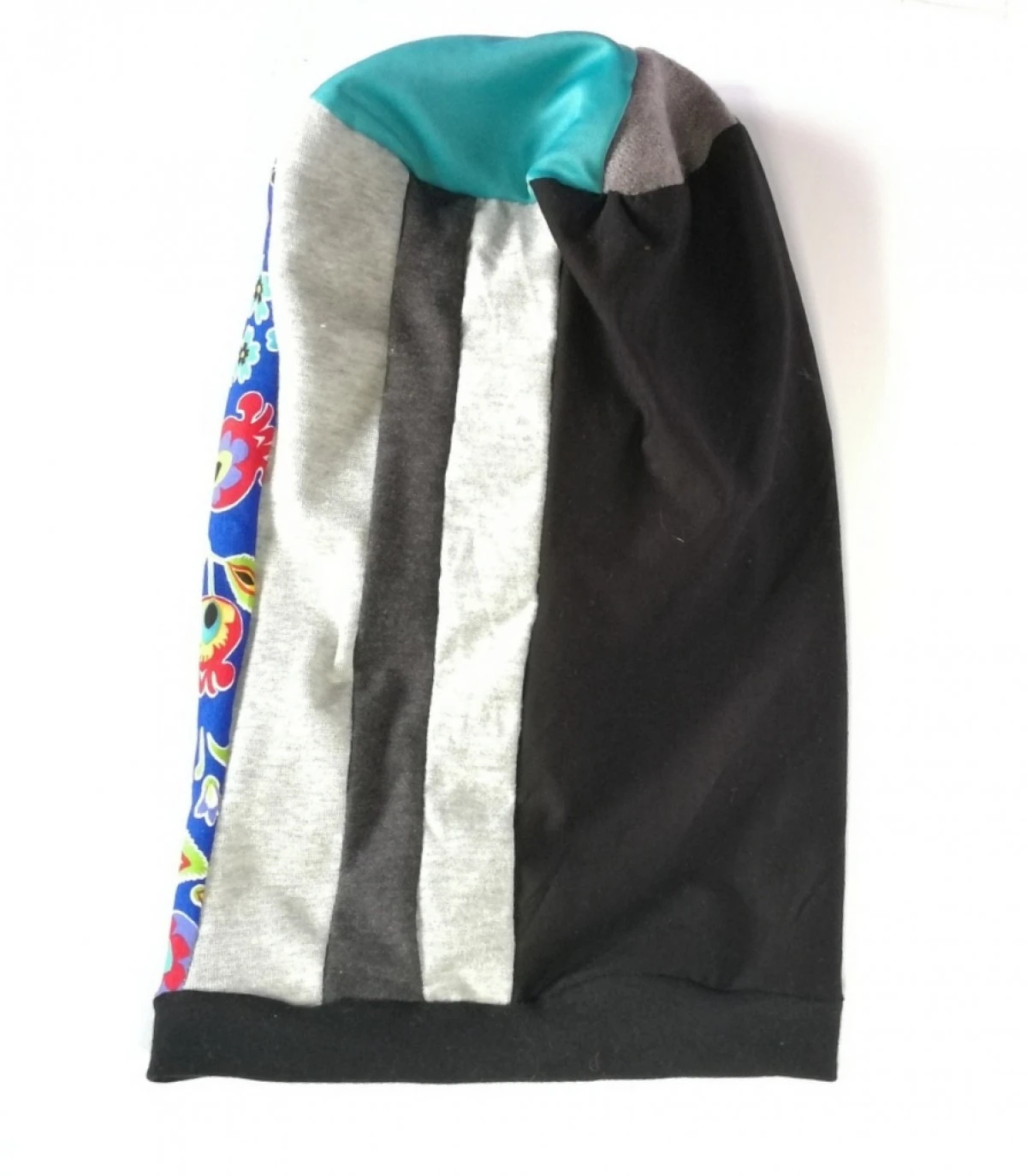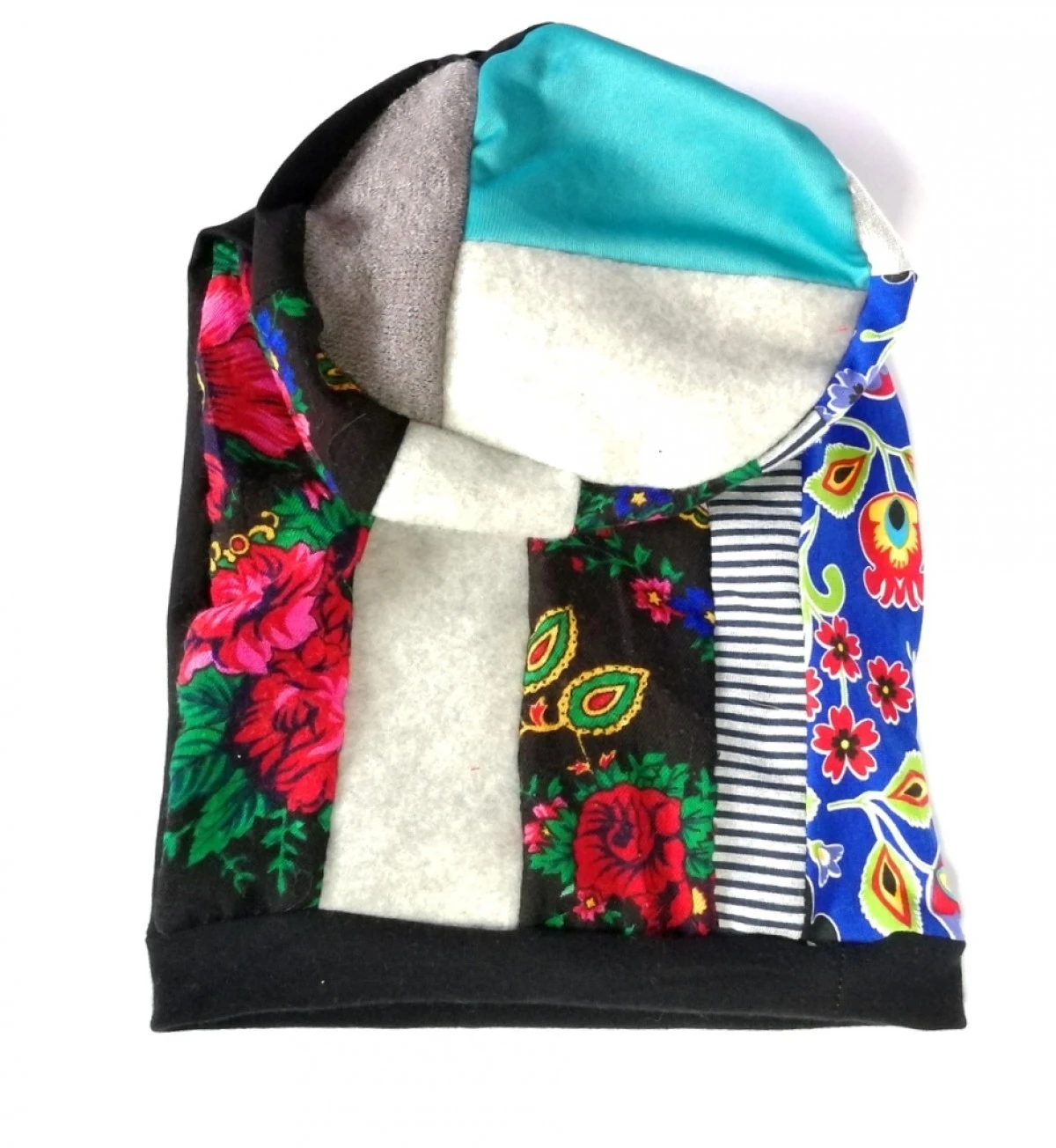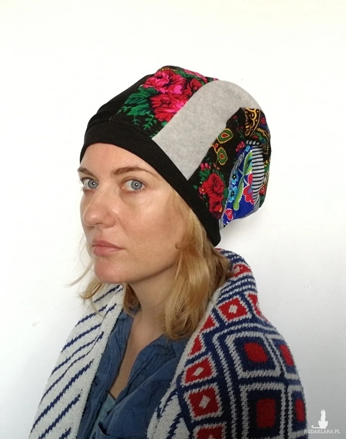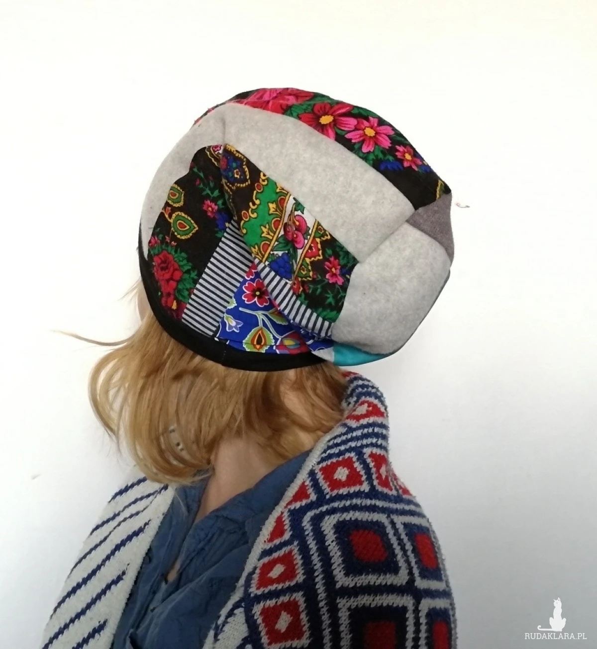 czapka damska ludowa folk patchwork-Aparacik ma na zębach cały w otrębach-box 44- obwód głowy 57-58cm, miękka, długa, kolorowa, ciepła, na dzianinowej podszewce, bardzo optymistyczna, pojedynczy egzemplarz-lekko rozciągliwa-polecam