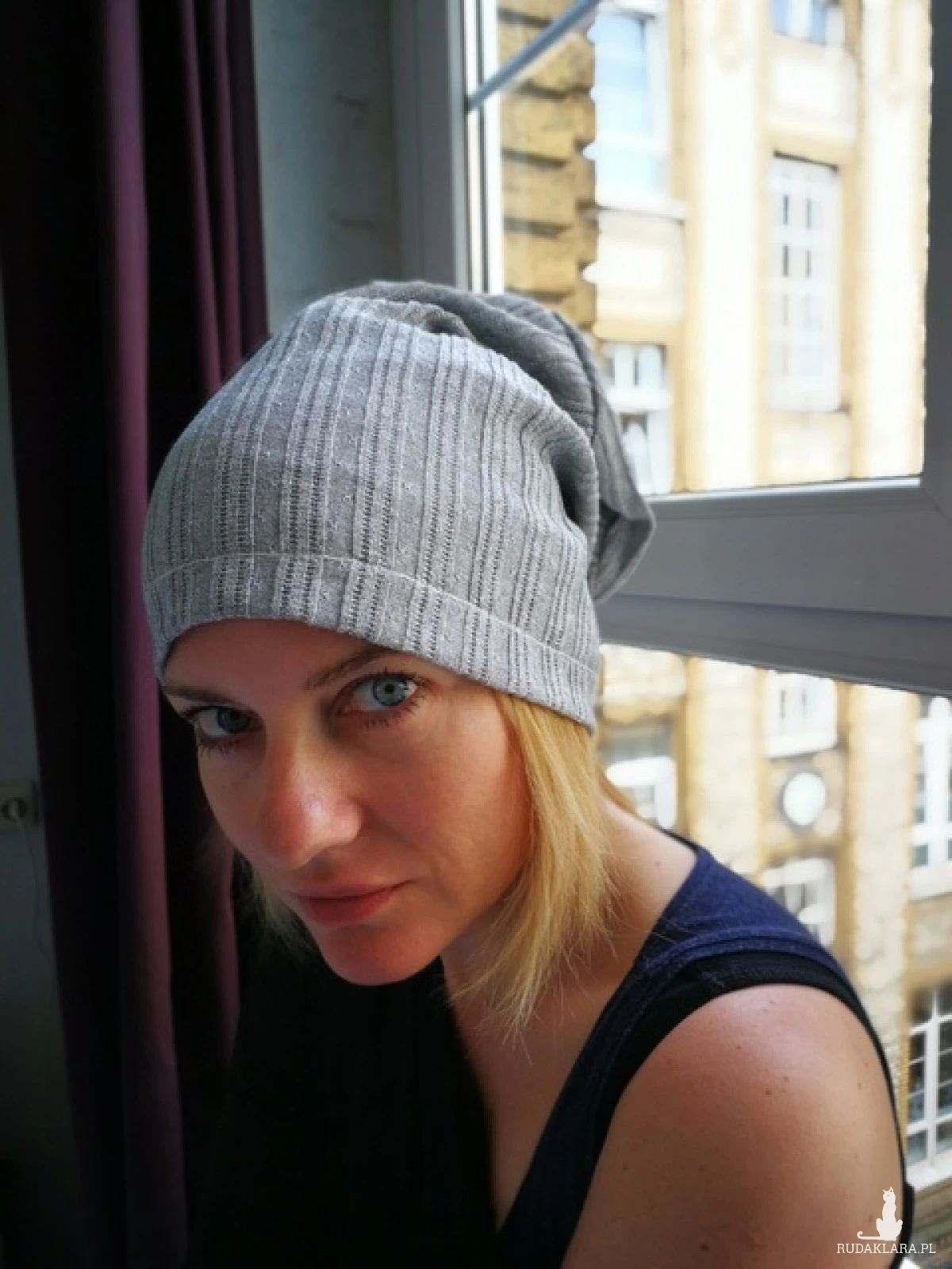 czapka damska srebrna przejściówka- box 44- Najważniejsze dorwać małego gdy śpi na całego- czapka wiosennam damska na podszewce, obwod głowy 60-61cm, miękka, lekko rozciągliwa, dobra na rower i szpan:)polecam