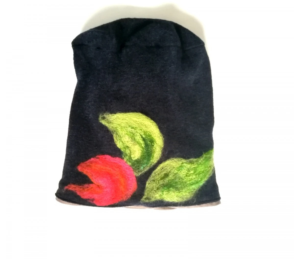 czapka wełniana filcowana czarna zimowa handmade w kwiaty na podszewce