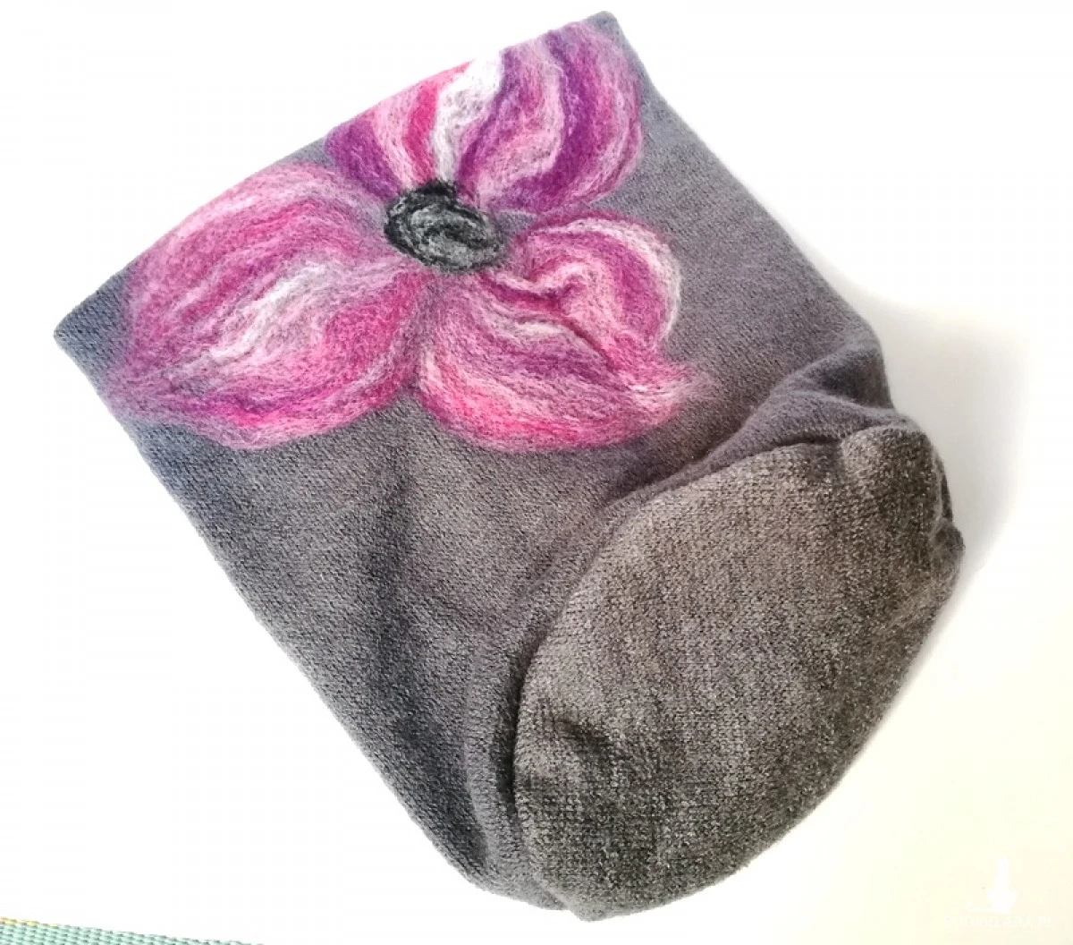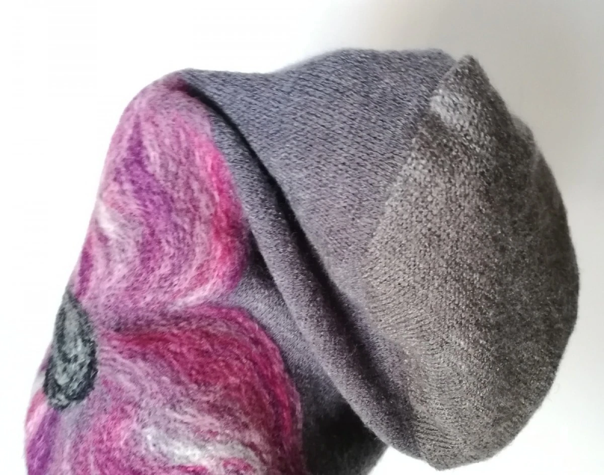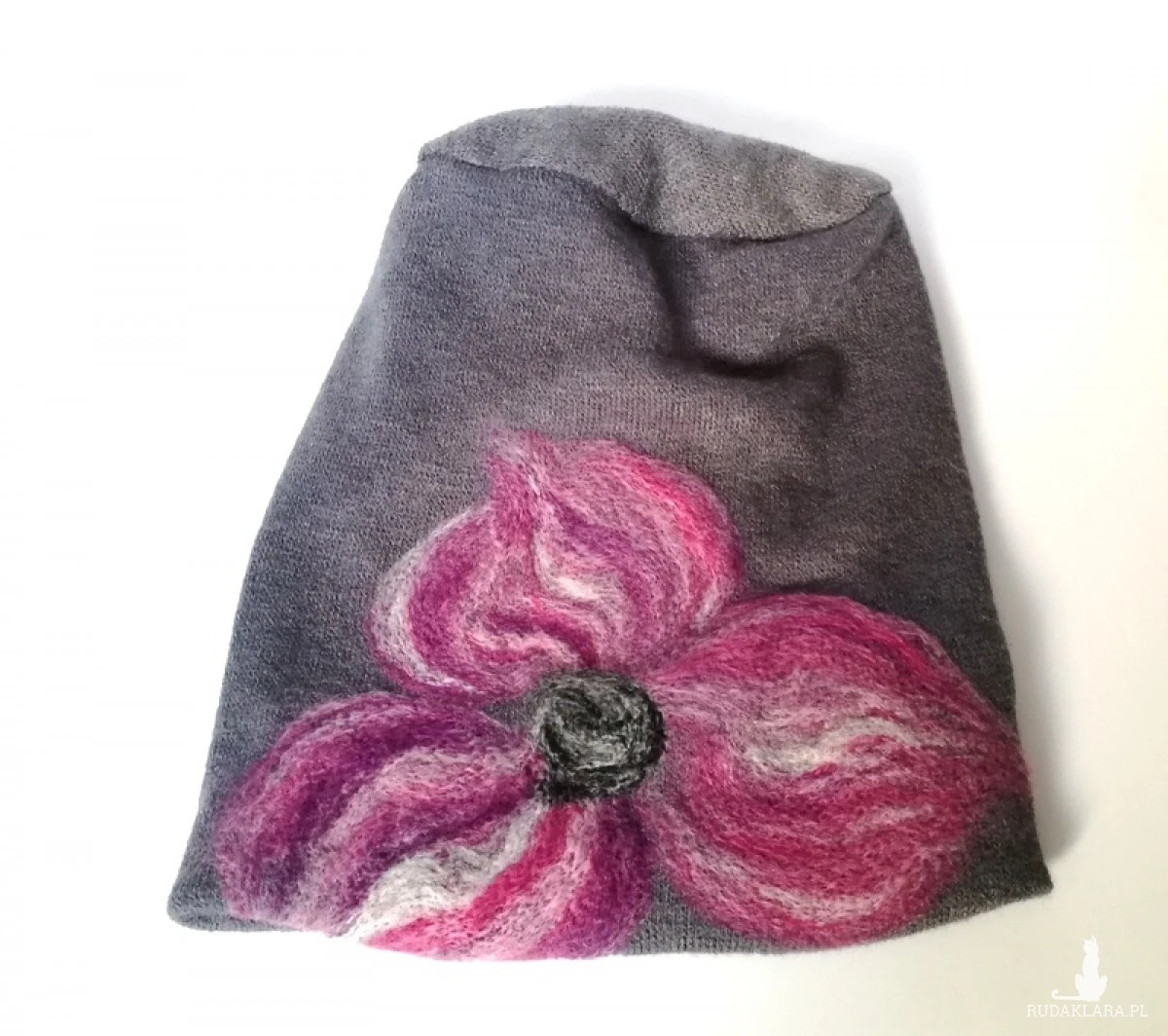 czapka wełniana filcowana szara zimowa handmade w kwiaty na podszewce-box 11- rozmiar uniwersalny, wełniana, filcowana wełną merynosów, bardzo ciepła, fantastyczna, miła, miękko układa się na głowie, niesamowicie zwraca uwagę, doskonałą na codzienne noszenie jak i na prezent, zawsze możesz ją założyć po basenie i przeżyjesz z mokrą głową:) naprawdę superowa -pojedyncze egzemplarze, polecam-baza szara, góra czapki delikatnie różni się odcieniem od dołu