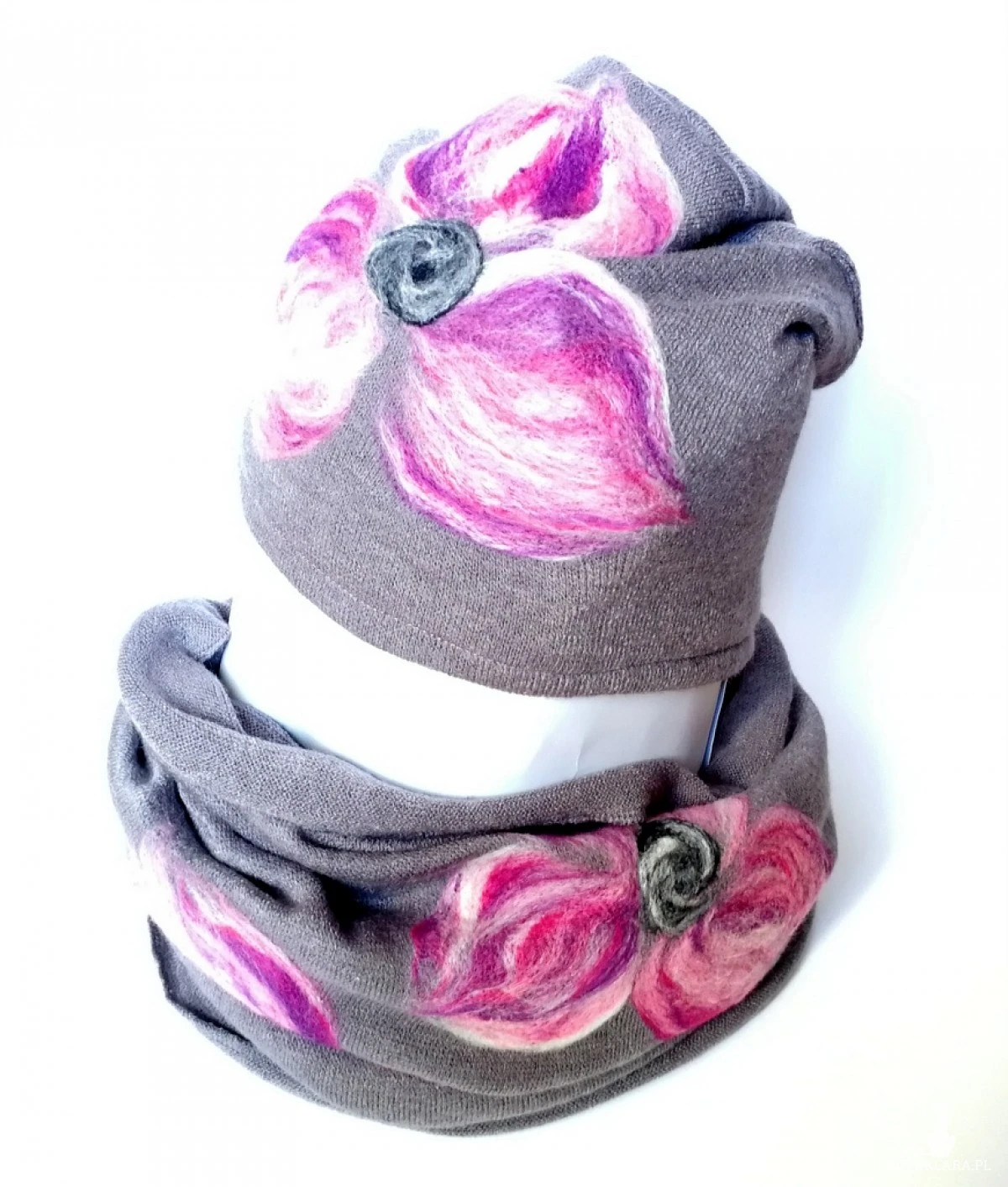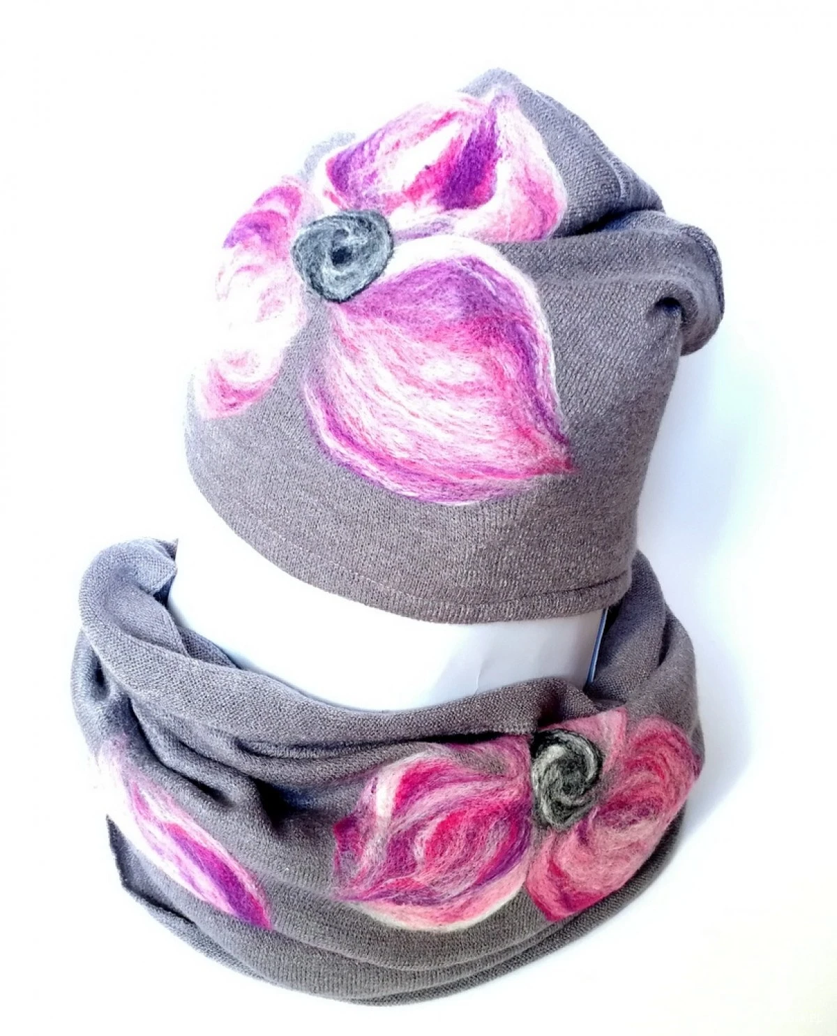 komplet wełniany szary- wełna z kwiatami zachwyca godzinami- czapka wełniana obwód 59-61cm, miękka, miła na podszewce, chusta wełniana,komplet filcowany wełną merynosów, cudny, ciepły, doskonały na codzienne noszenie, na prezent, na dłużej, polecam