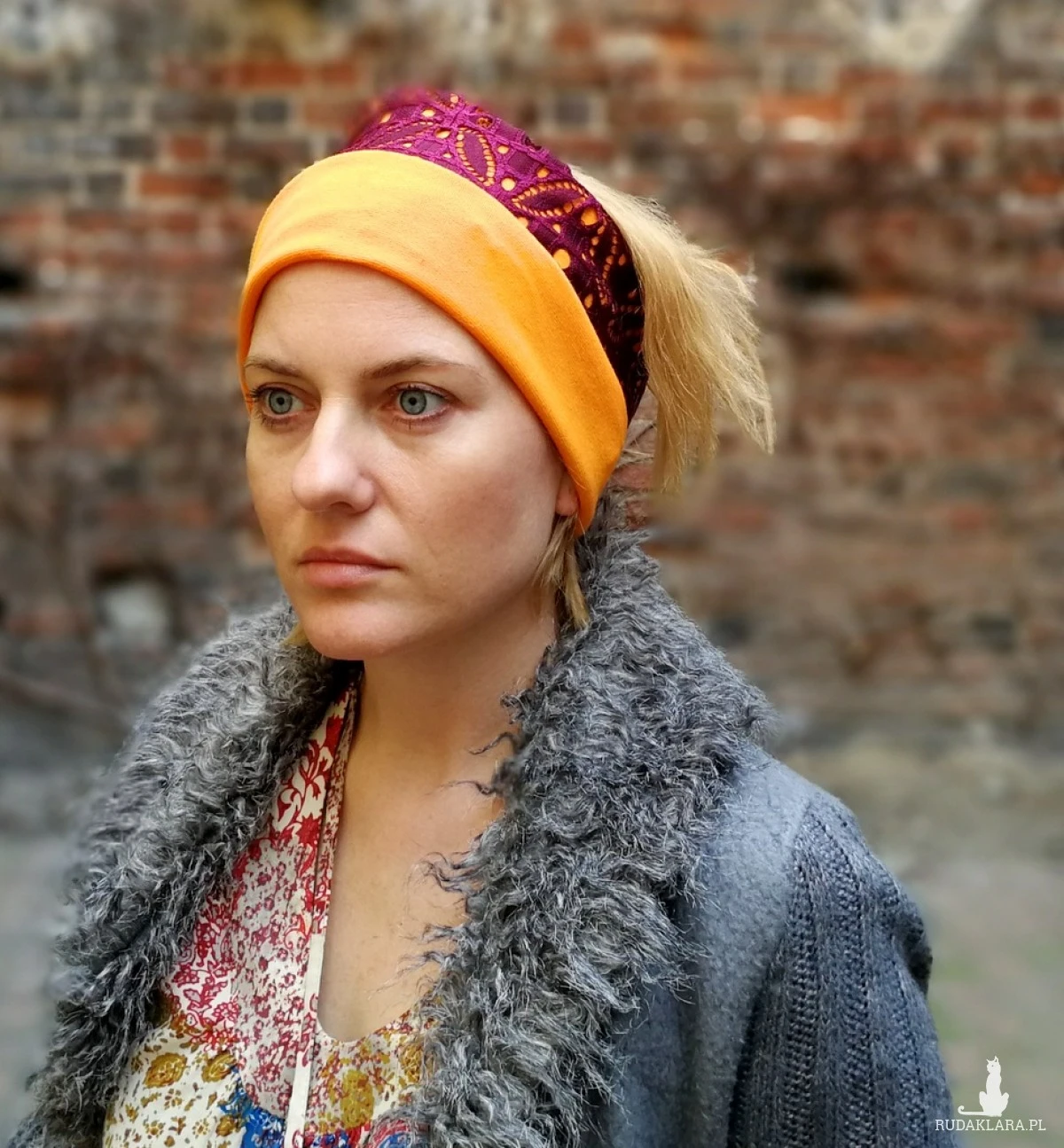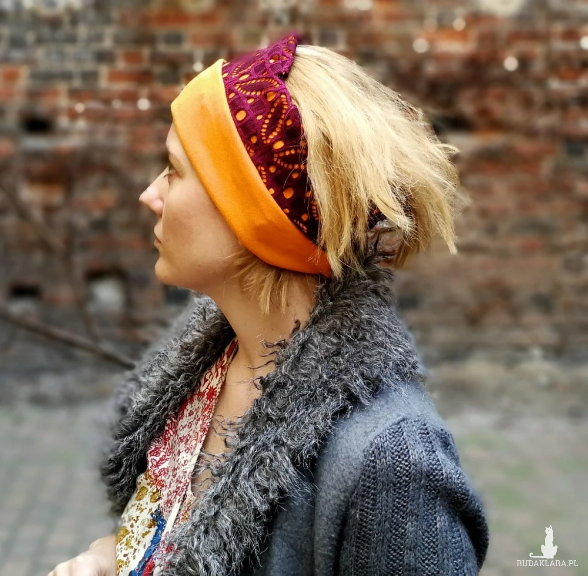 koronkowa bordowa szeroka opaska na pomarańczu-box d1- opaska obwód głowy 60-61cm, szerokość 19cm,lekko rozciągliwa koronka bordo na pomarańczowej dzianinie , polecam- opaska jest duża ale na życzenie mogę ją zmniejszyć